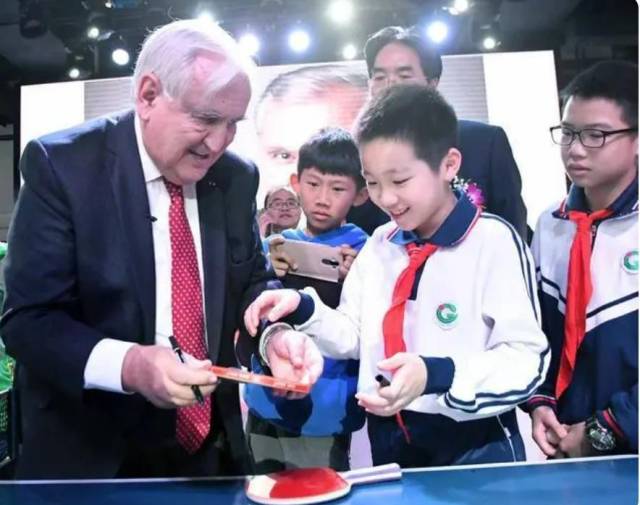 演讲结束后,拉法兰与广州的小学生进行了一场“迷你”乒乓球赛。赛后他与小球员互赠乒乓球拍,并在现场回忆起首次访粤的情形,感慨过去40余年,广州最大的变化是人们的生活变得更好了。