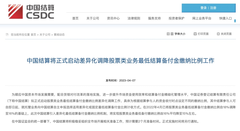 中国证券登记结算有限责任公司官网日前发布消息,拟根据结算参与人的资金收付时点设定不同的缴纳比例,将股票类业务最低结算备付金缴纳比例由16%平均降至15%左右。