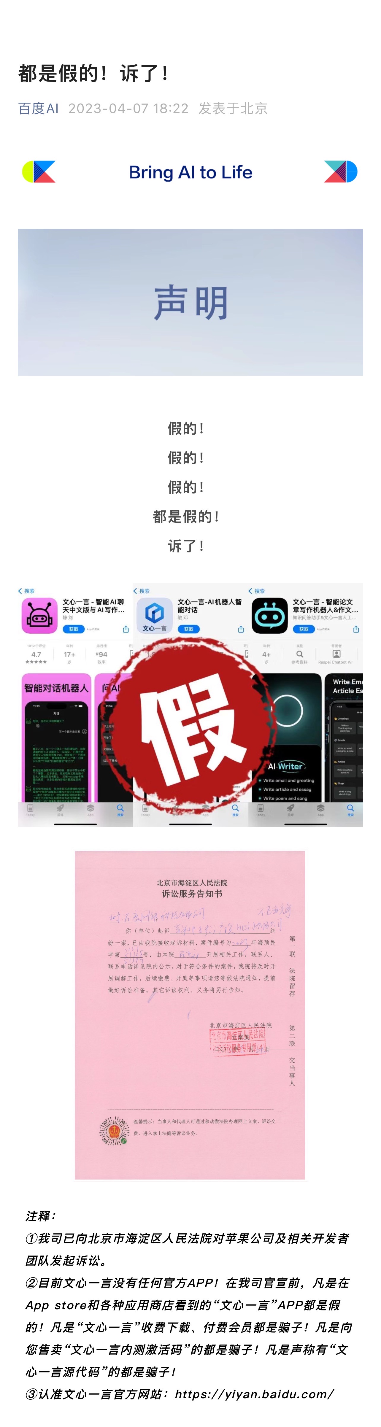 声明表示,公司官宣前,凡是在App Store和各种应用商店看到的“文心一言”App都是假的。凡是“文心一言”收费下载、付费会员都是骗子。凡是向用户售卖“文心一言内测激活码”的都是骗子,凡是声称有“文心一言源代码”的都是骗子。