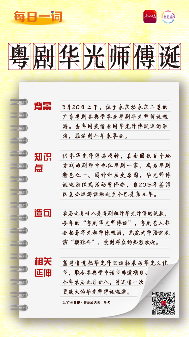 农历九月廿八是粤剧祖师华光师傅的诞辰,每年的“粤剧华光师傅诞”,粤剧艺人都会抬着华光祖师像巡游,龙虎武师沿途表演“翻跟斗”,受到群众的热烈欢迎。