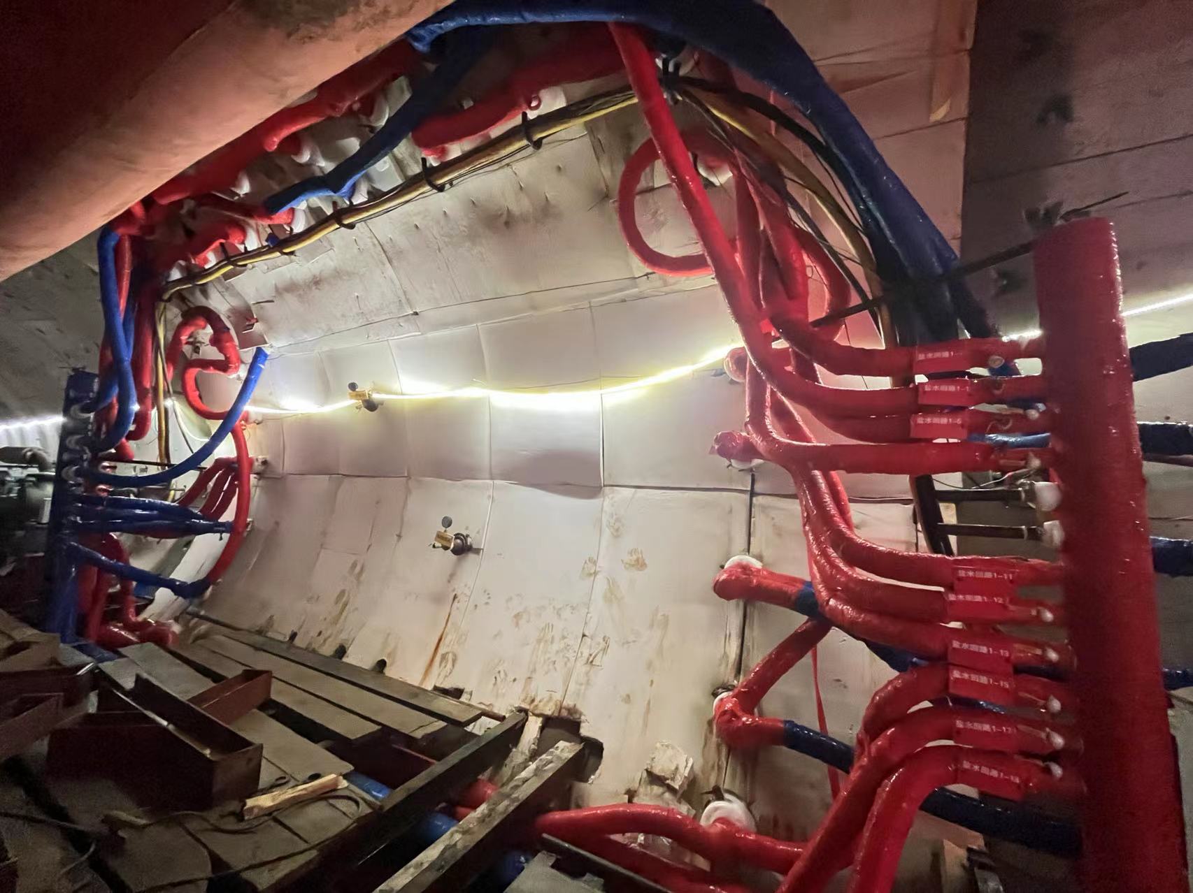 建设者们在软弱地层通过内部循环低温盐水的冻结管,使周边地层结冰冻结,保证地层稳定。冻结孔采用两次开孔,孔口密封装置安装到位后再进行钻进施工,同时及时进行补偿注浆,最终实现“钻孔零喷涌”。在建设者们的努力下,历时40天安全平稳完成通道开挖与二次结构施工,为全线冷冻法联络通道施工提供经验及技术保障。