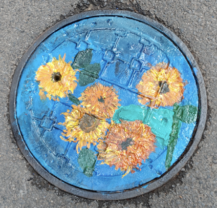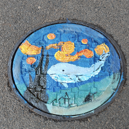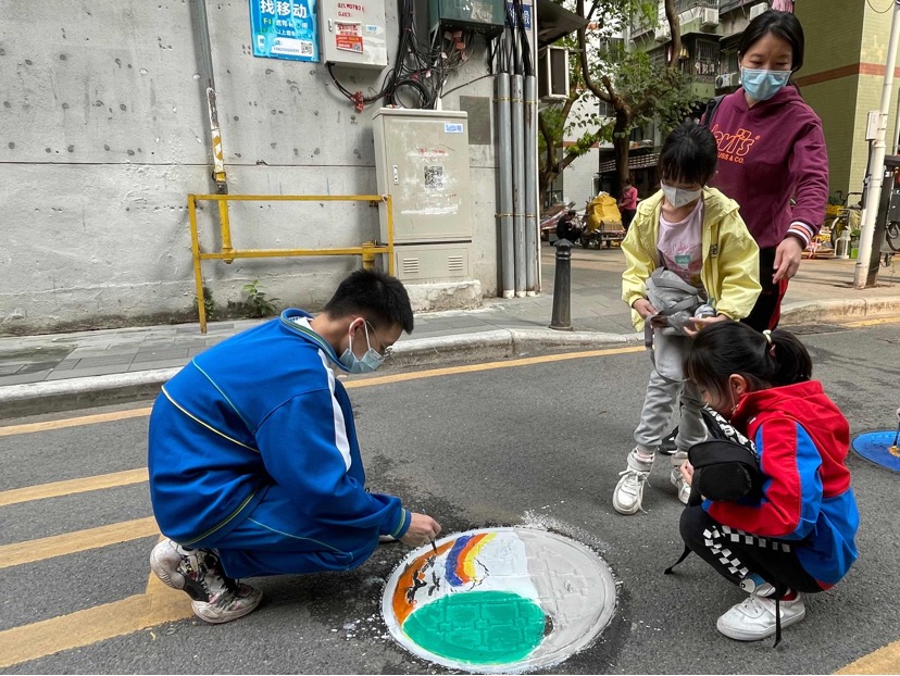 清洁井盖、调制颜料、上色、勾线、喷漆……同学们有条不紊地开展工作。在他们全情创作的过程中,许多街坊被吸引,更有一些街坊加入彩绘中,一位有美术功底的街坊还为同学们的部分画作提出了色彩搭配与层次感的修改意见。经过一下午的努力,学生们的作品顺利绘制到一个个井盖上,色彩斑斓的井盖,为园中园社区增添了一道亮丽的风景线。