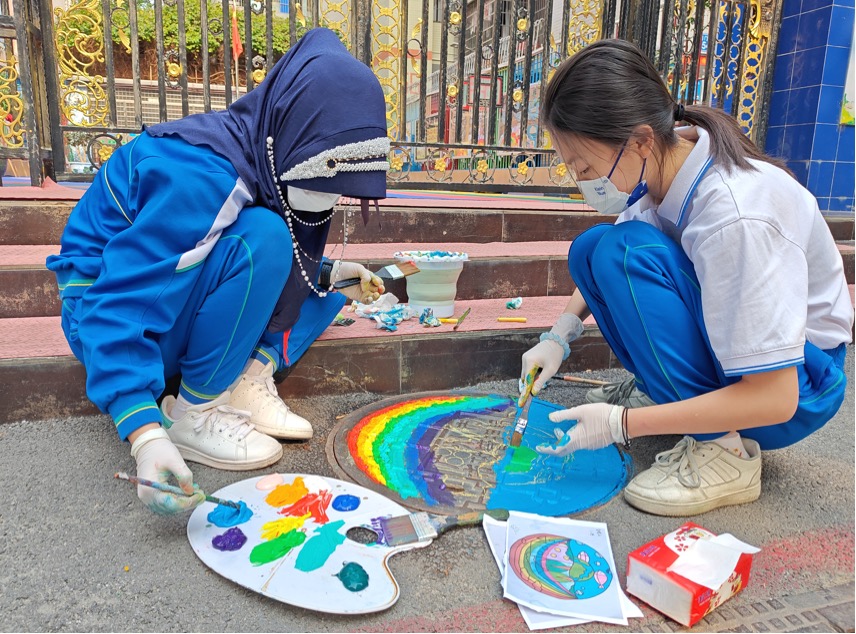 活动前期,彩虹街社工服务站的社工与西关外国语学校老师合作,组织学生完成前期的作品征集,最终共收集到20幅画作,每一幅画作都蕴含着学生们对守护彩虹、美丽彩虹的理解。最终12幅作品被选出、绘制到沙井盖上。