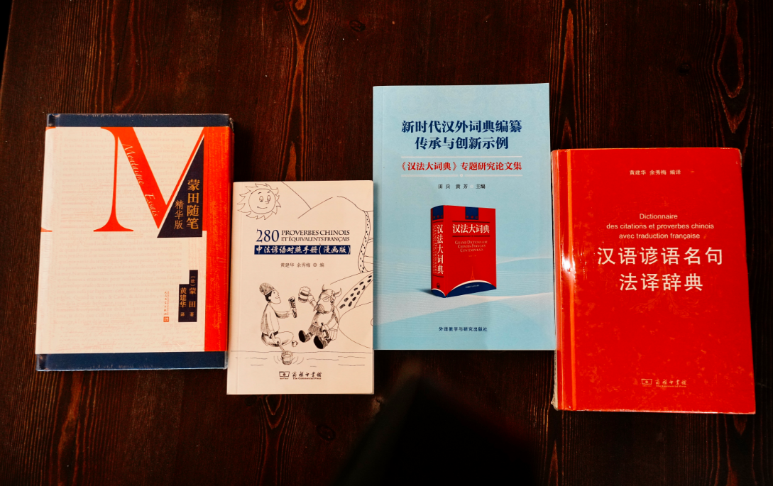在故事会上,黄建华谦虚地称自己只是“和法国语言文化打交道”。“第一样是翻译,我翻译了不少法国有关的社科著作,比如《自然法典》《公有法典》《论实证精神》等。”“另外一项工作是编写辞书,早年编写了《法汉词典》《新简明法汉词典》,比较大的工作是主编《汉法大词典》。还有一些小书,例如翻译的《蒙田随笔》和编写《中法谚语对照手册:漫画版》。”