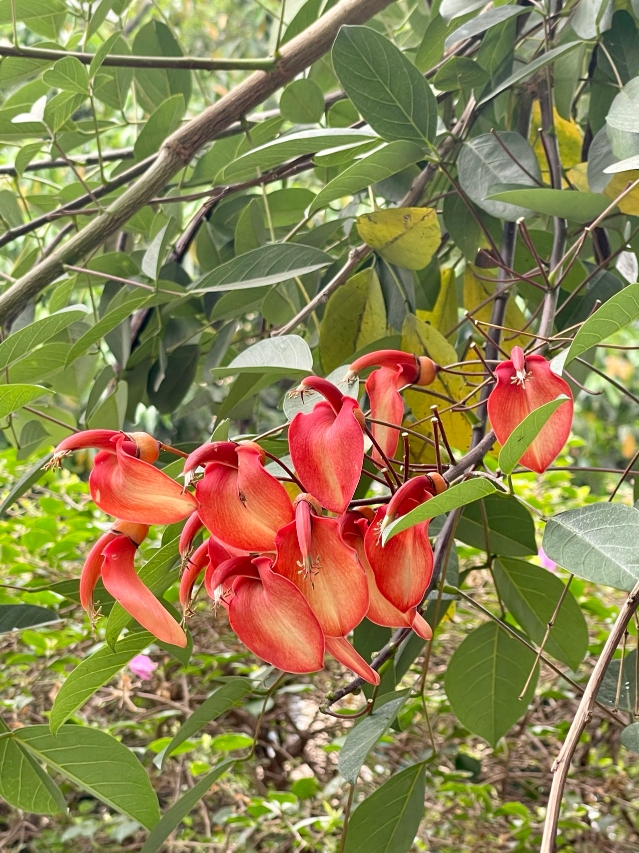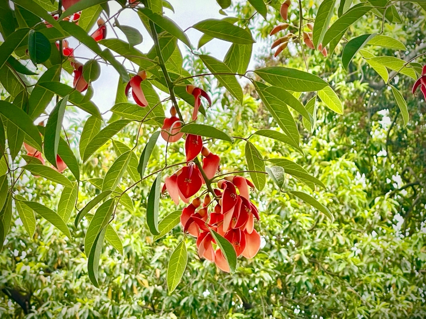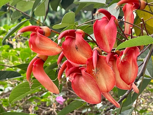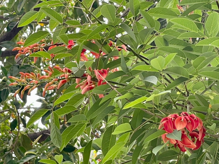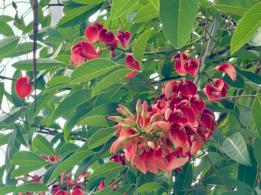 鸡冠刺桐又称作赛波树,是豆科刺桐属的小乔木。由于同属的关系,乍一眼看上去,它的花朵和珊瑚刺桐有点像,同样热情洋溢的花色,蝶形花冠同样有五片花瓣,分别称为旗瓣、翼瓣与龙骨瓣。与簇簇相拥的珊瑚刺桐不同,鸡冠刺桐总状花序自枝伸出,旗瓣较开张呈蚌壳状,远看造型如鸡冠而得名。