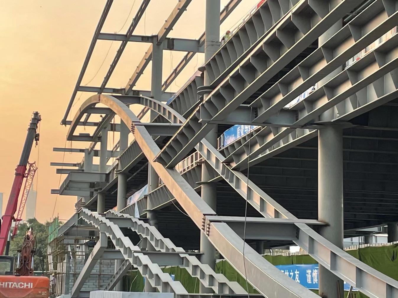 琶洲港澳客运码头以独特的波浪造型俯瞰着珠江,呈现行云流水般自然舒展的形态。项目于2020年7月7日开工建设,需要克服复杂的周边环境:首层主体架空结构横跨海珠有轨电车,因列车运行期间不得进行主体结构吊装作业,项目工期受到挑战;基坑南侧紧邻有轨电车,地下室施工过程对电车轨道影响作用评估难度大;基坑底下穿在建广州地铁11号线琶员盾构隧道区间,灌注桩距离隧道最小距离仅为3.3米,灌注桩施工过程受地铁隧道施工影响大。