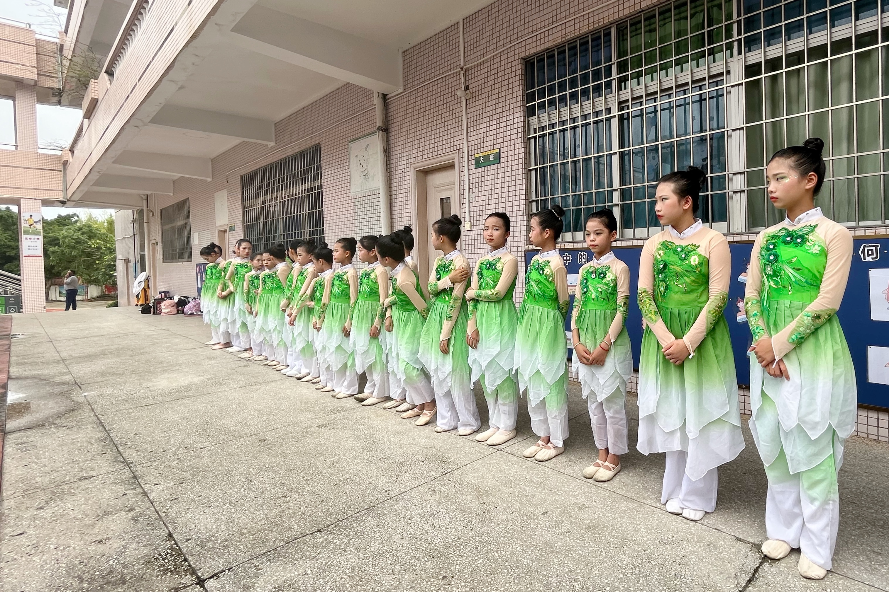 画上俏皮的妆容,身着亮绿色表演服,一阵掌声之后,来自乡村小学——阳江平章小学的留守儿童嘉惠,终于如愿登上“家门口”的舞台,向一众与会嘉宾表演舞蹈《茉莉花》。一年前的嘉惠,绝不会想到自己竟在一年后能掌握舞蹈这一门极富美感的艺术课程。