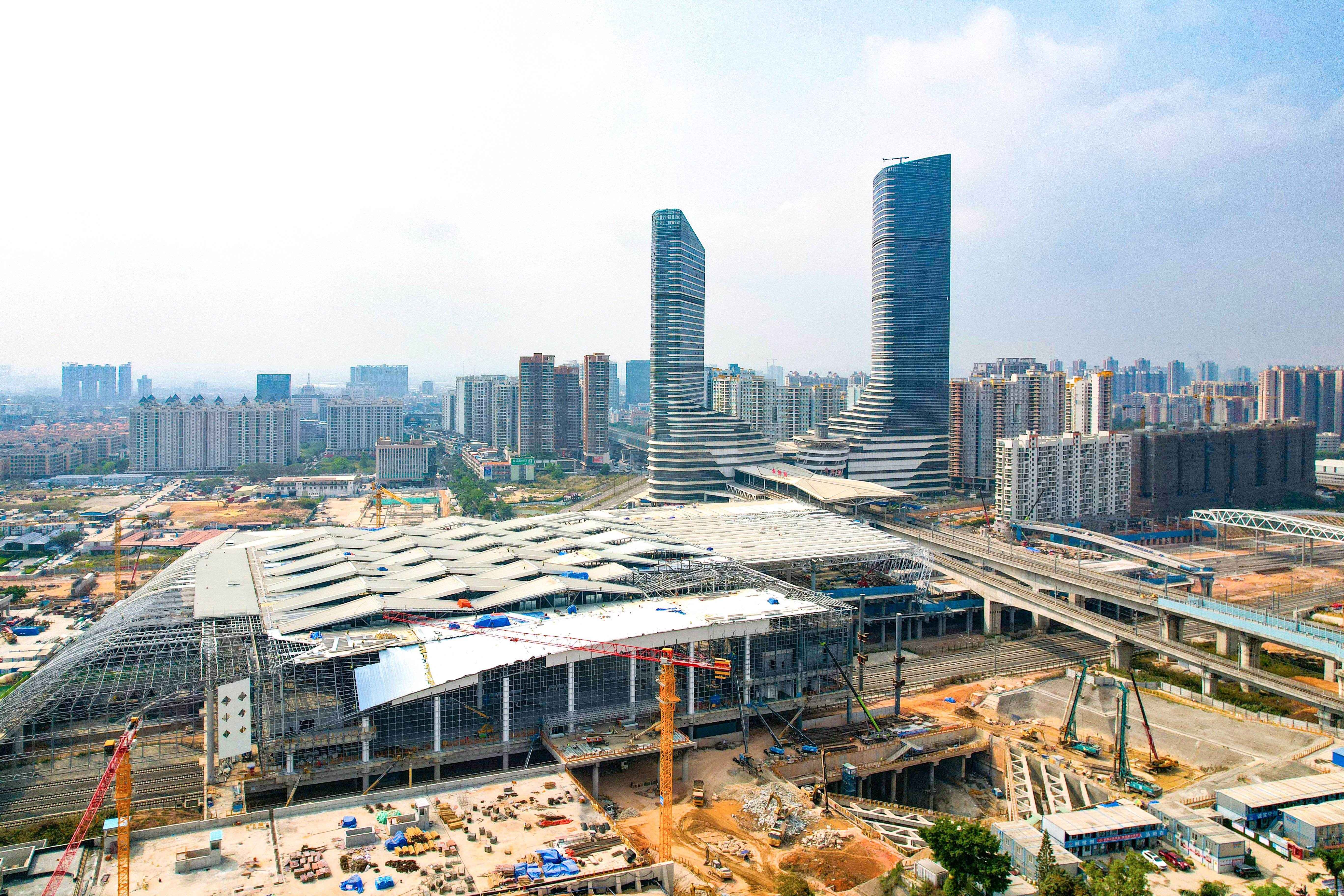 “新塘站站房目前已全面进入装饰装修阶段,总体工程量已经完成80%。项目组正在加紧赶工,保证新塘站高质量完工。”中铁四局建筑公司新塘站项目党支部书记曾尚文介绍,新塘站建筑规模约为18.4万平方米,包括站房工程的5万平方米和配套工程13.4万平方米(停车场、综合交通枢纽一体化工程)。新塘站设计融入城市空间,围绕交通中心形成“一心、两轴、三区”品字形结构,秉承TOD开发理念, 紧扣车站定位和城市区位,打造“畅通融合、绿色温馨、经济艺术、智能便捷”的全新铁路枢纽客站。