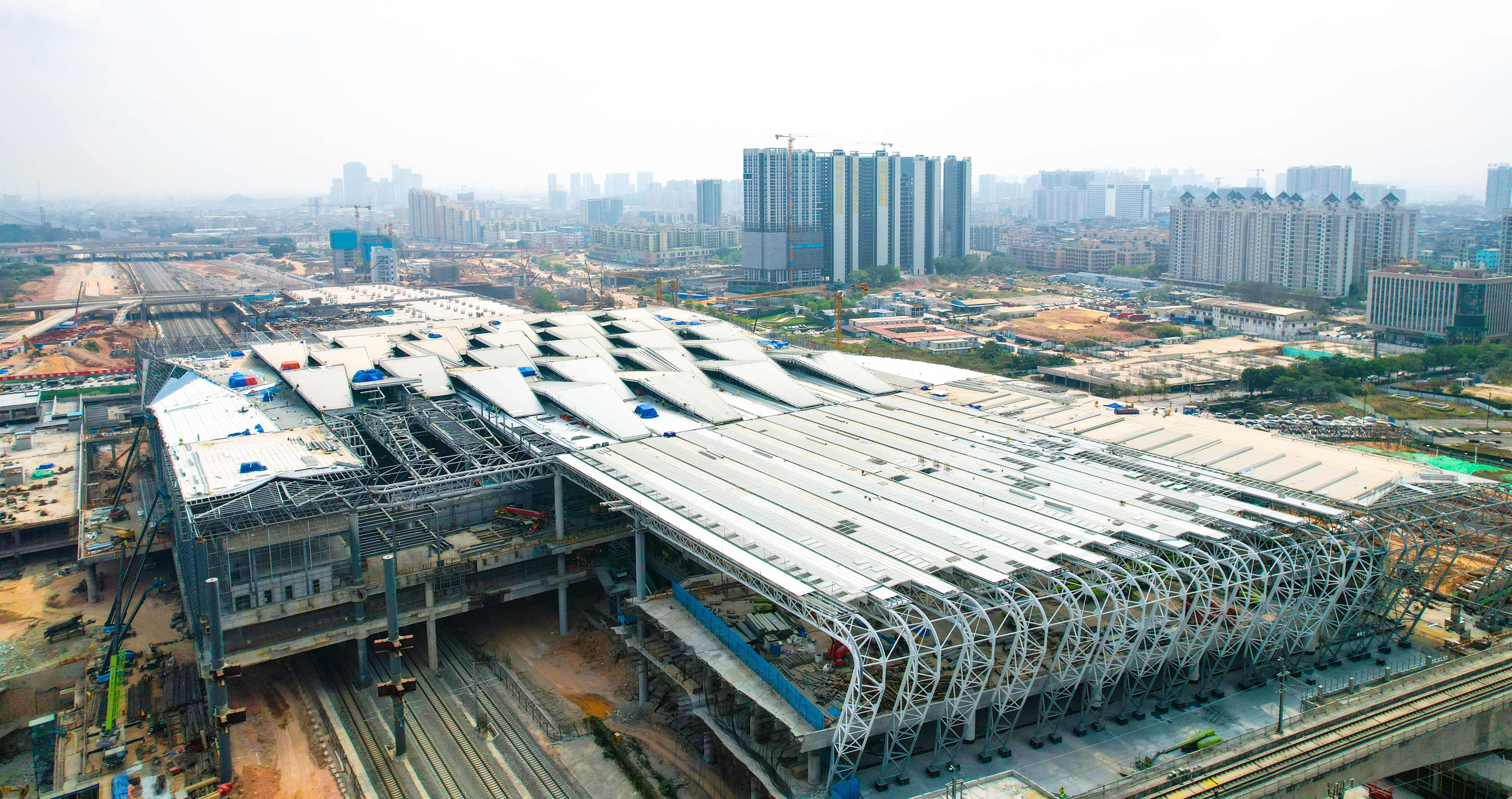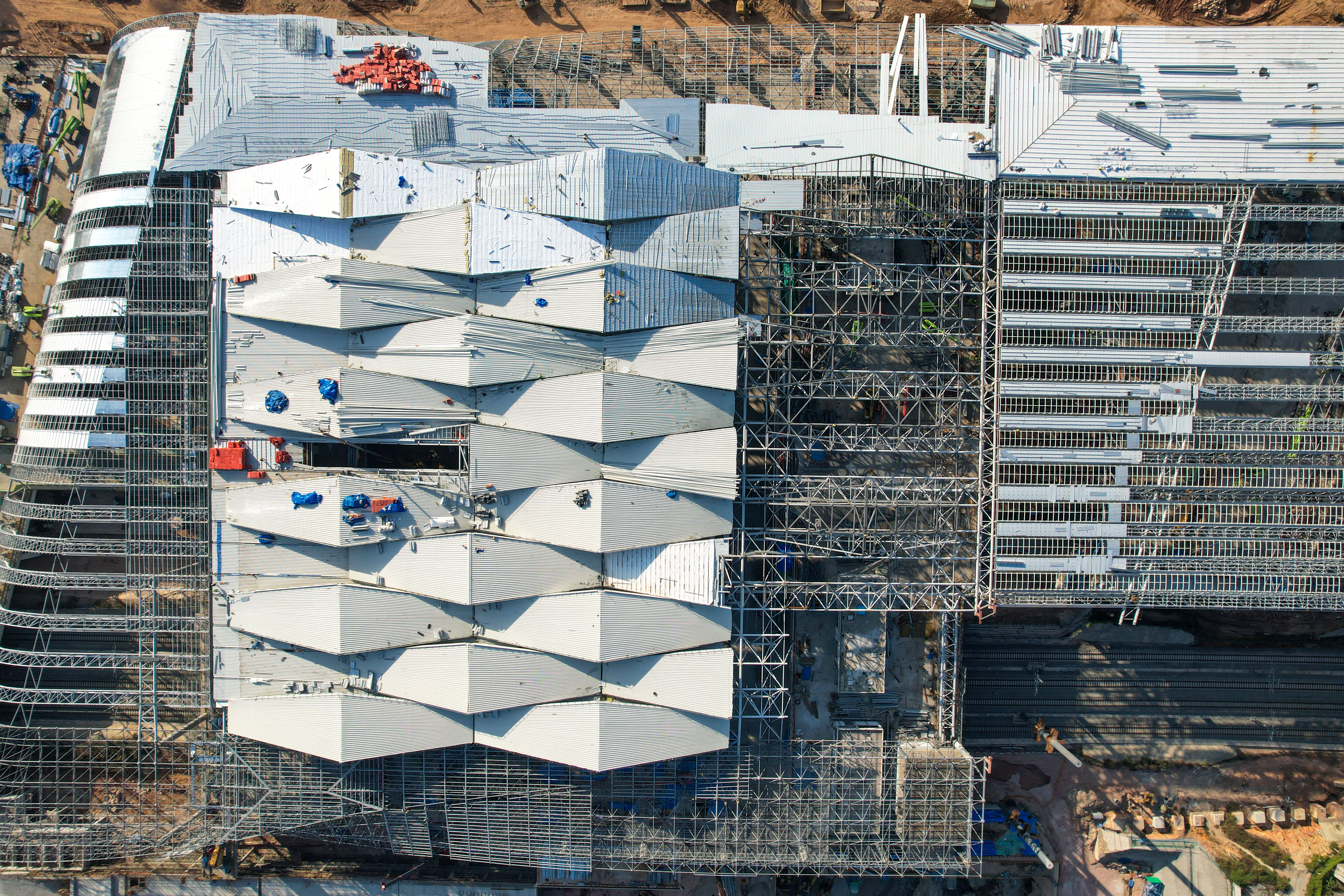 新塘站房顶外观,28块巨型扭曲金属屋面弯曲蜿蜒,从高空俯视就像客家舞蹈中的赛龙舟,顶如风,尾如浪,寓意与列车一起“百舸争流”。