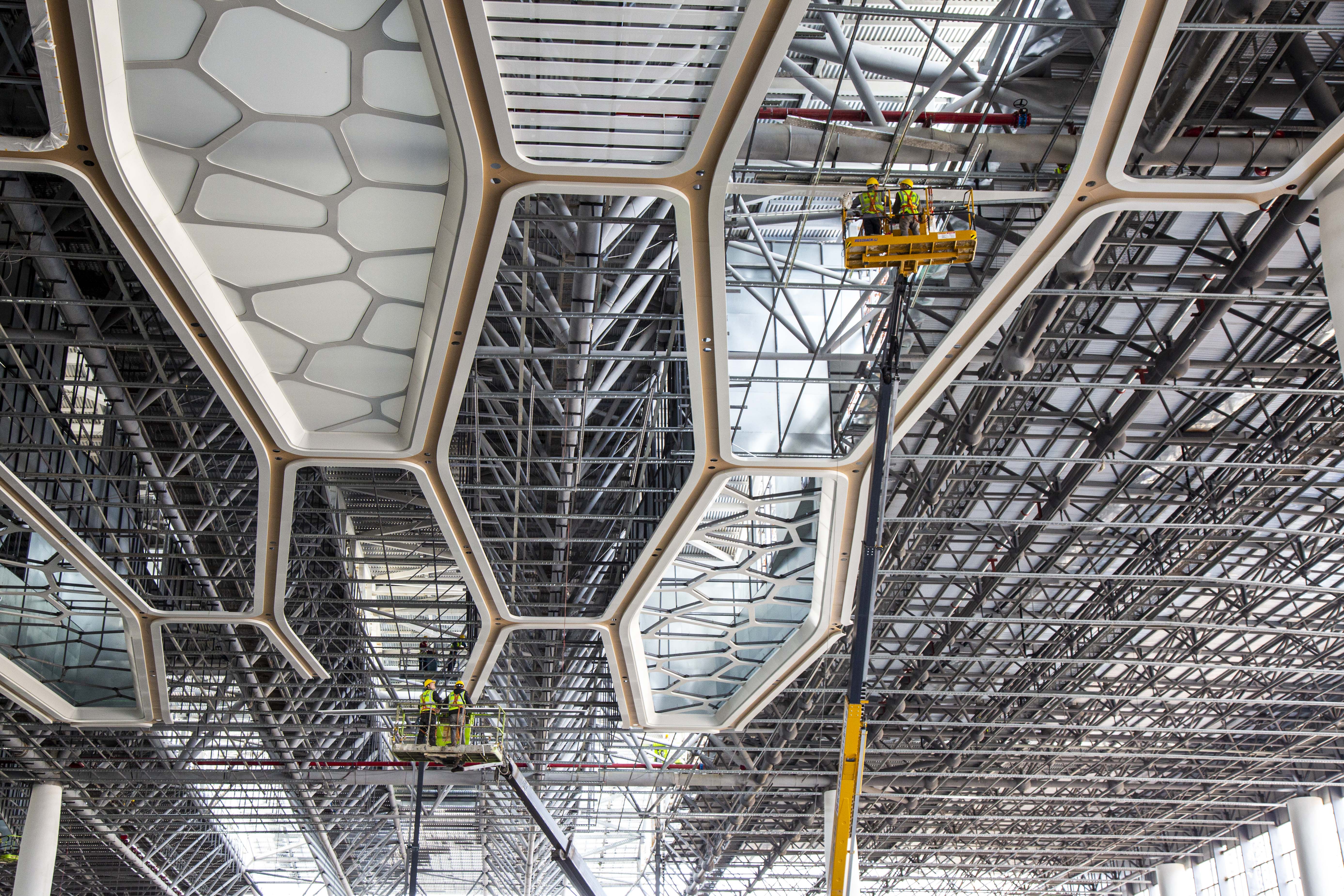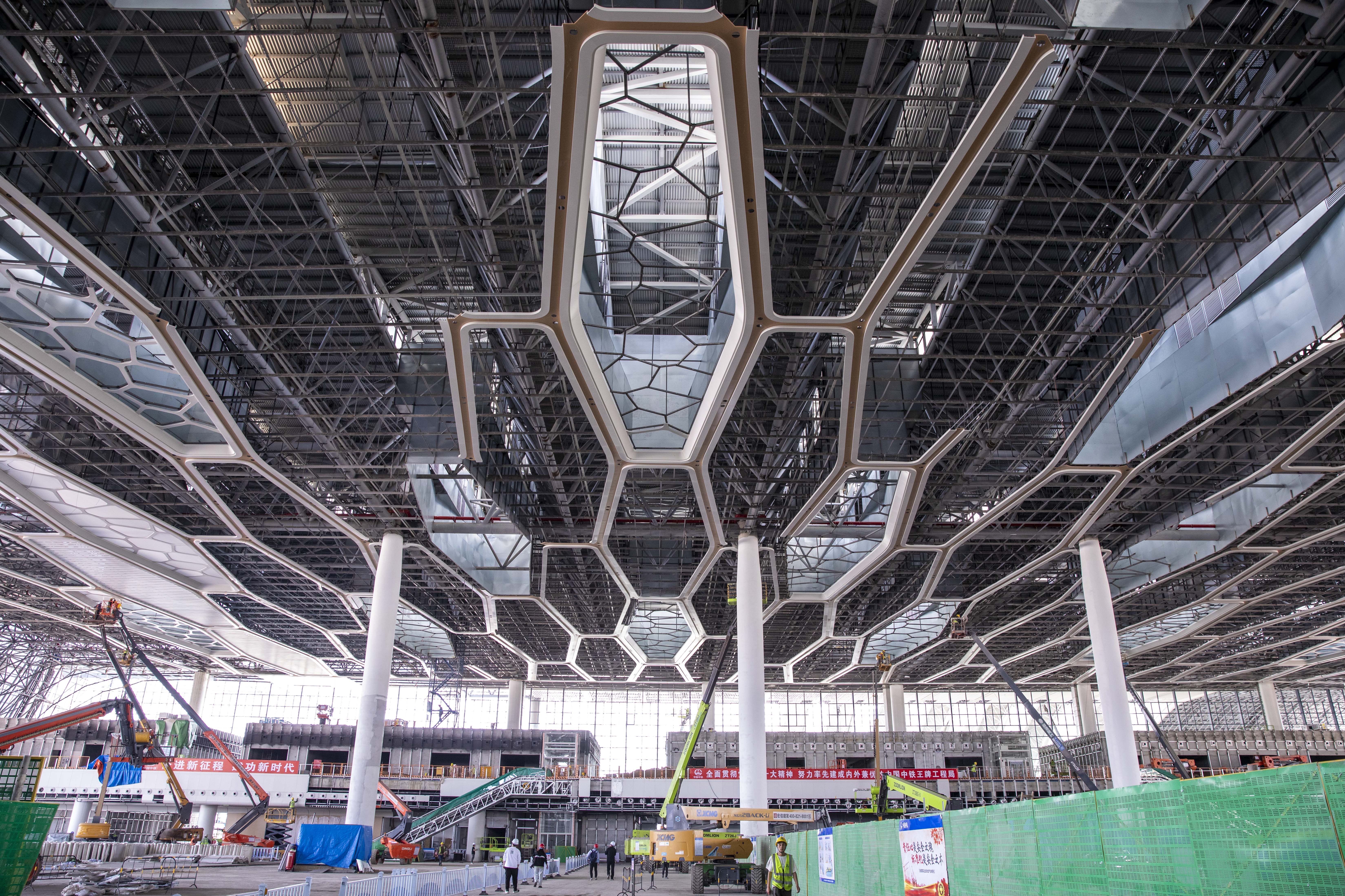 增城区新塘镇,记者走进正在紧锣密鼓加紧建设的新塘站站房大厅,抬头望去,只见几名工人正在近20米的高空安装天花板异形膜结构吊顶。