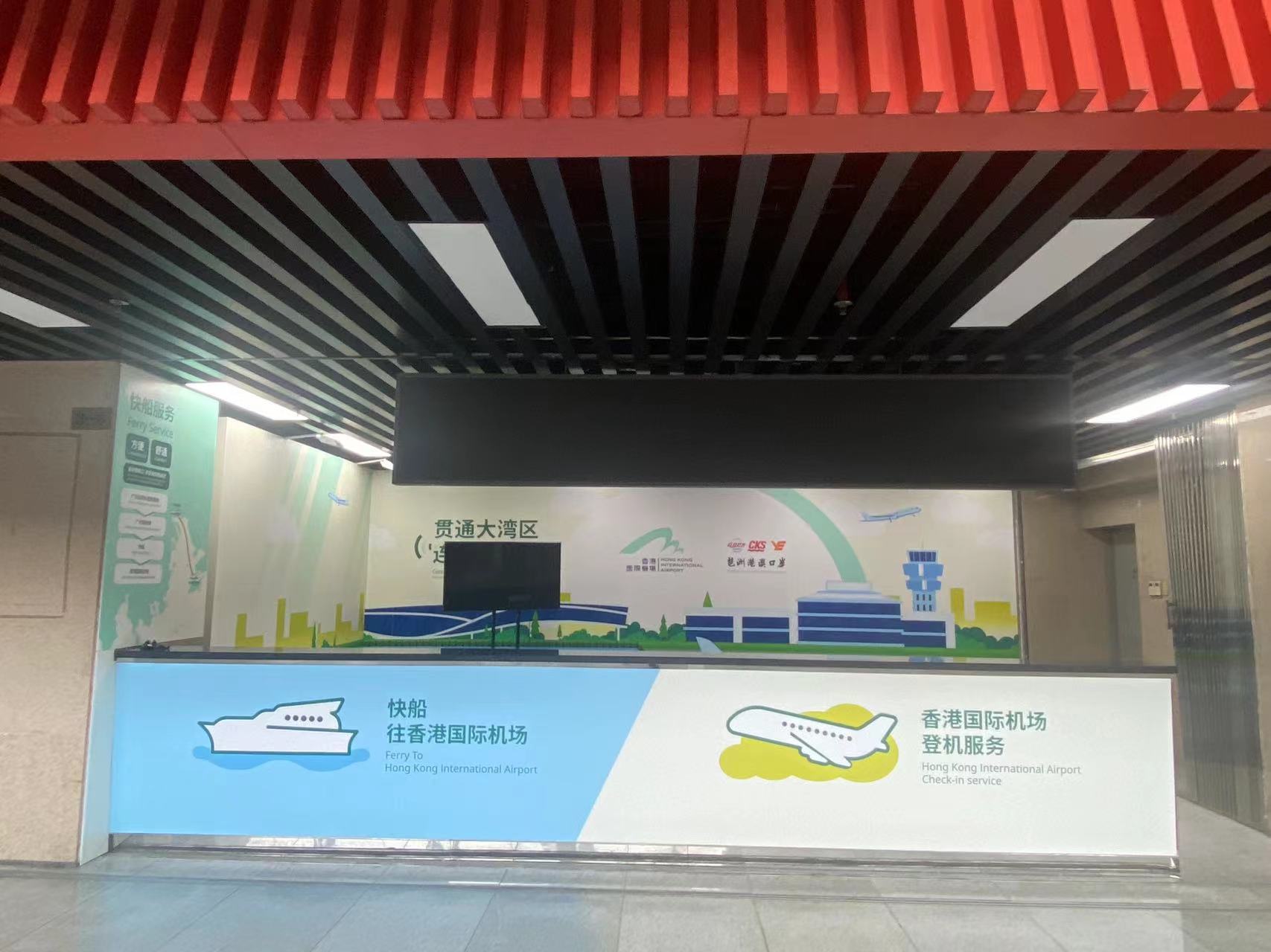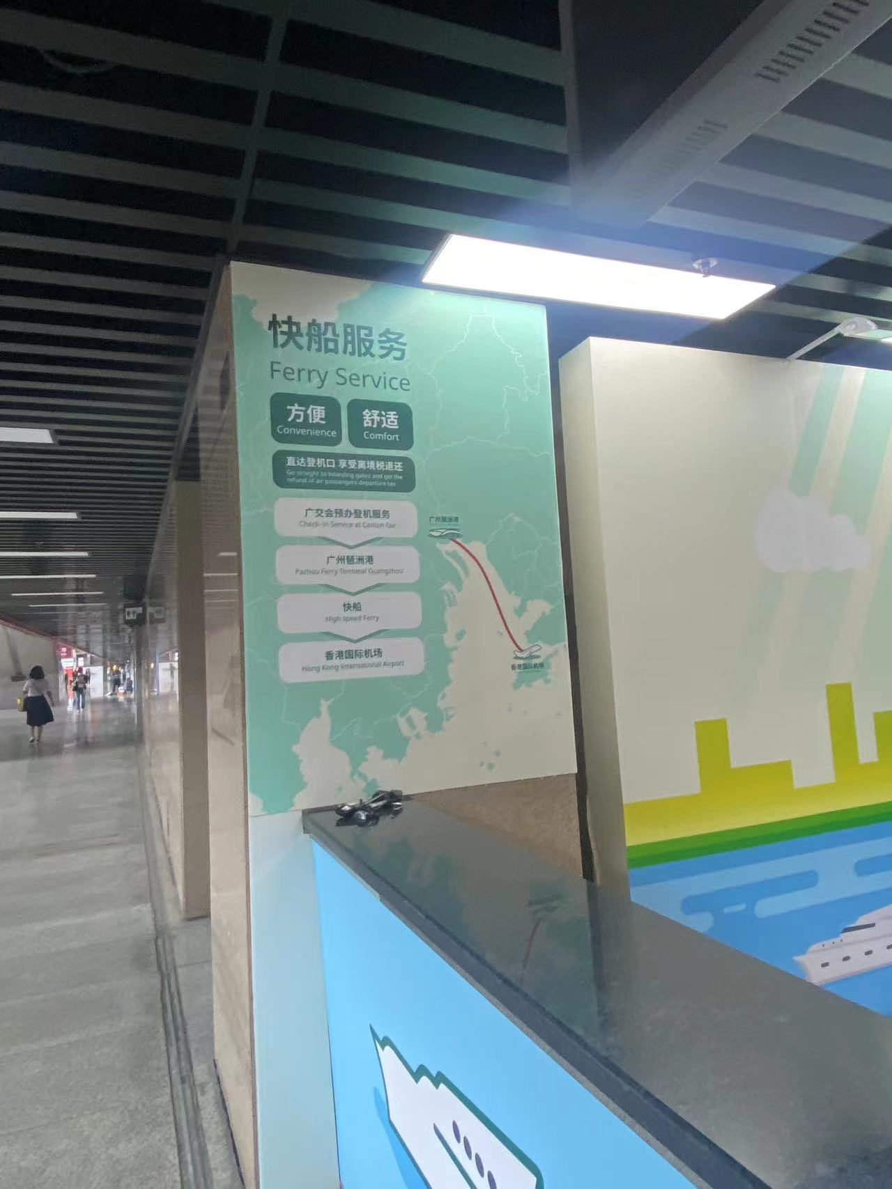 4月13日,记者在琶洲广交会展馆内看到,琶洲港澳口岸的服务柜台已完成搭建。据柜台宣传介绍,提供的快船服务是“广交会预办登机服务-广州琶洲港-快船-香港国际机场”。
