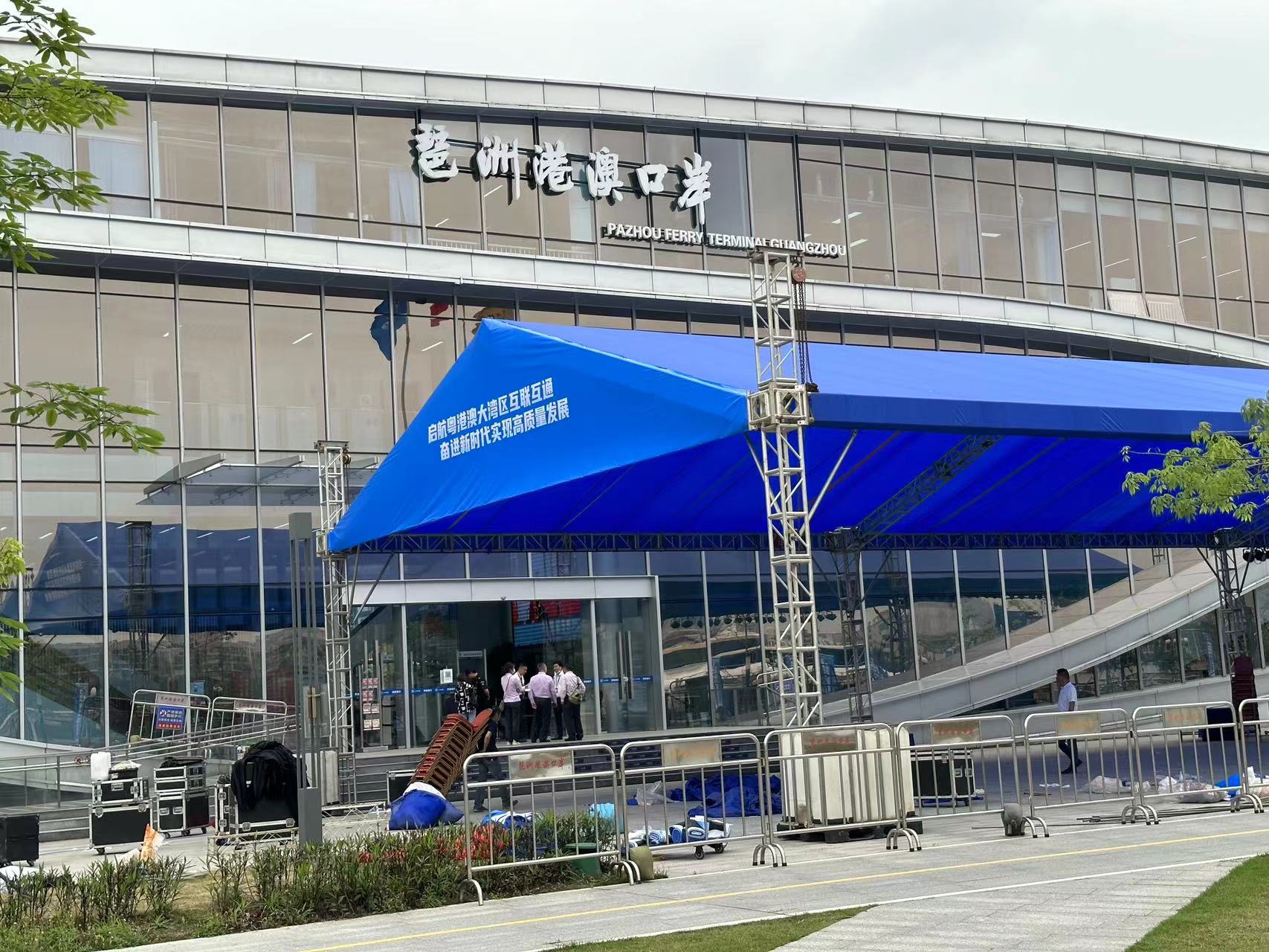 “请问可以在哪里购票?”“去香港国际机场的船票要多少钱?”“如果我开车到这里坐船,私家车可以停哪?”……4月13日午间1点多,全媒体记者来到琶洲港澳口岸,看到有市民在询问现场工作人员相关问题,同时,琶洲港澳客运口岸的小广场正在紧锣密鼓地搭建户外帐篷,现场工作人员对记者表示,为发布会做准备。