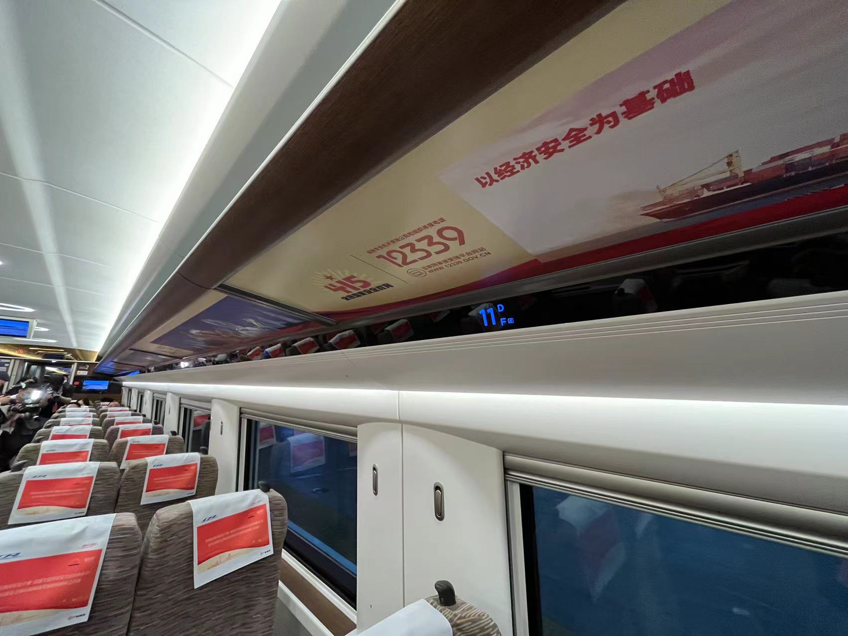在开行仪式现场,步入G878次列车车厢,乘客可以感受到满满的国家安全元素。在这列国家安全宣传教育高铁列车内,展板、小桌板、头枕巾、行李架、车门玻璃贴等处均贴有“贯彻总体国家安全观,增强全民国家安全意识和素养,夯实以新安全格局保障新发展格局的社会基础”“以人民安全为宗旨”“统筹外部安全和内部安全”等宣传标语以及国家安全机关受理公民和组织举报电话12339。主办方还精心准备了印有“国家安全人人有责”字样的手提袋和文化衫,“安全感”十足。