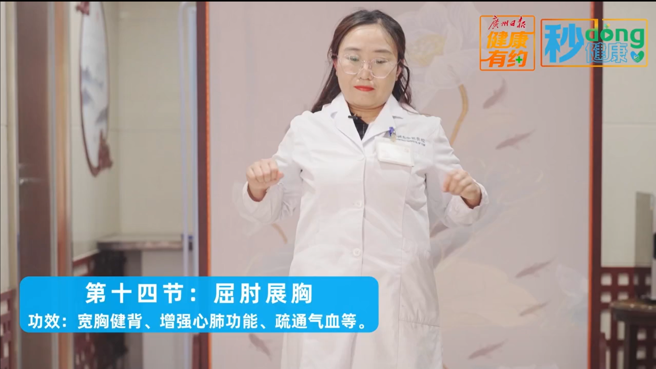 方法:两手握拳,拳心向内,肘平屈,左拳放在右肘上,拳略微超过肘,两臂用力向胸两侧扩展,挺胸,回臂右拳在左肘上。