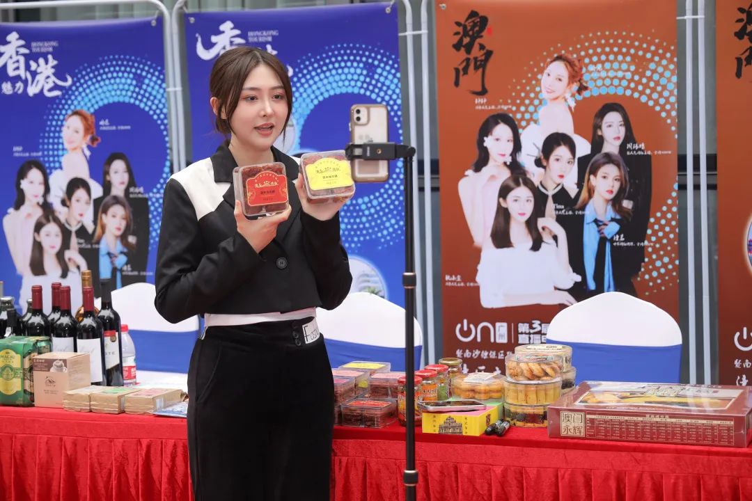 活动现场,直播达人为参展品牌进行直播带货,直播间里堆满了澳门特色美食蛋卷、杏仁饼、猪肉脯、国际品牌斯维诗保健品等跨境商品,还有贵州白酒和南沙本土的产品……琳琅满目的商品通过直播达人们的卖力带货,呈现给全国消费者。