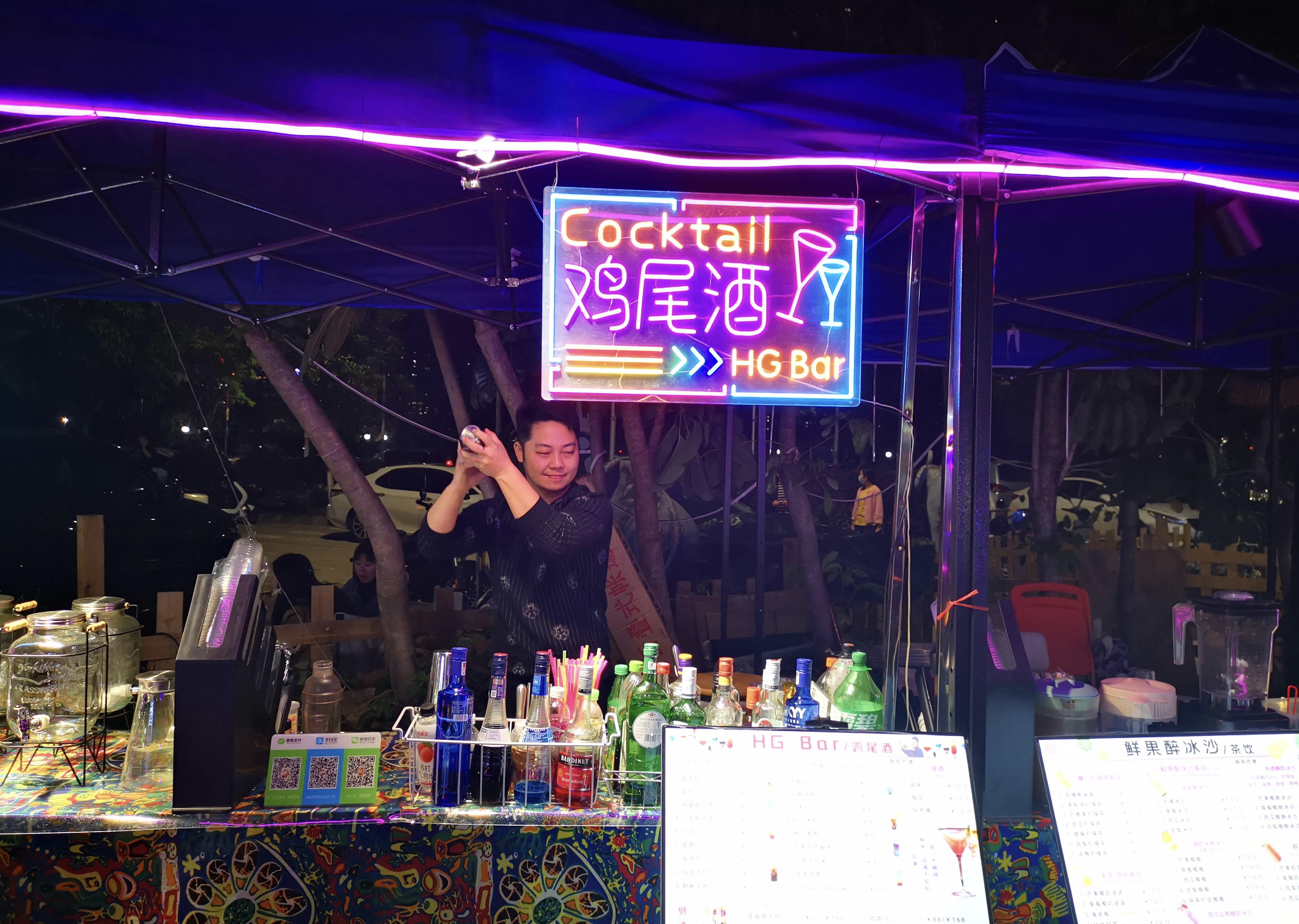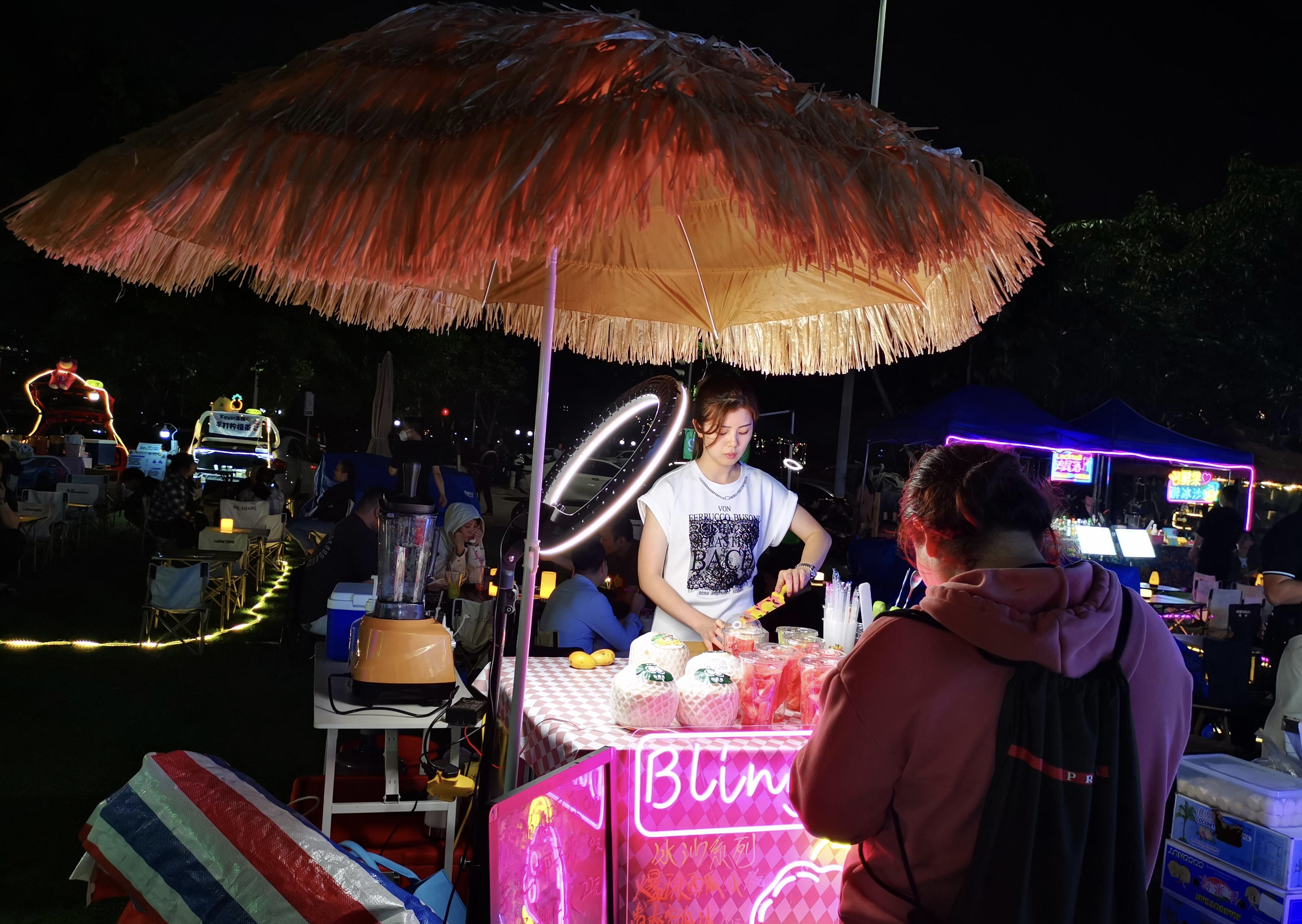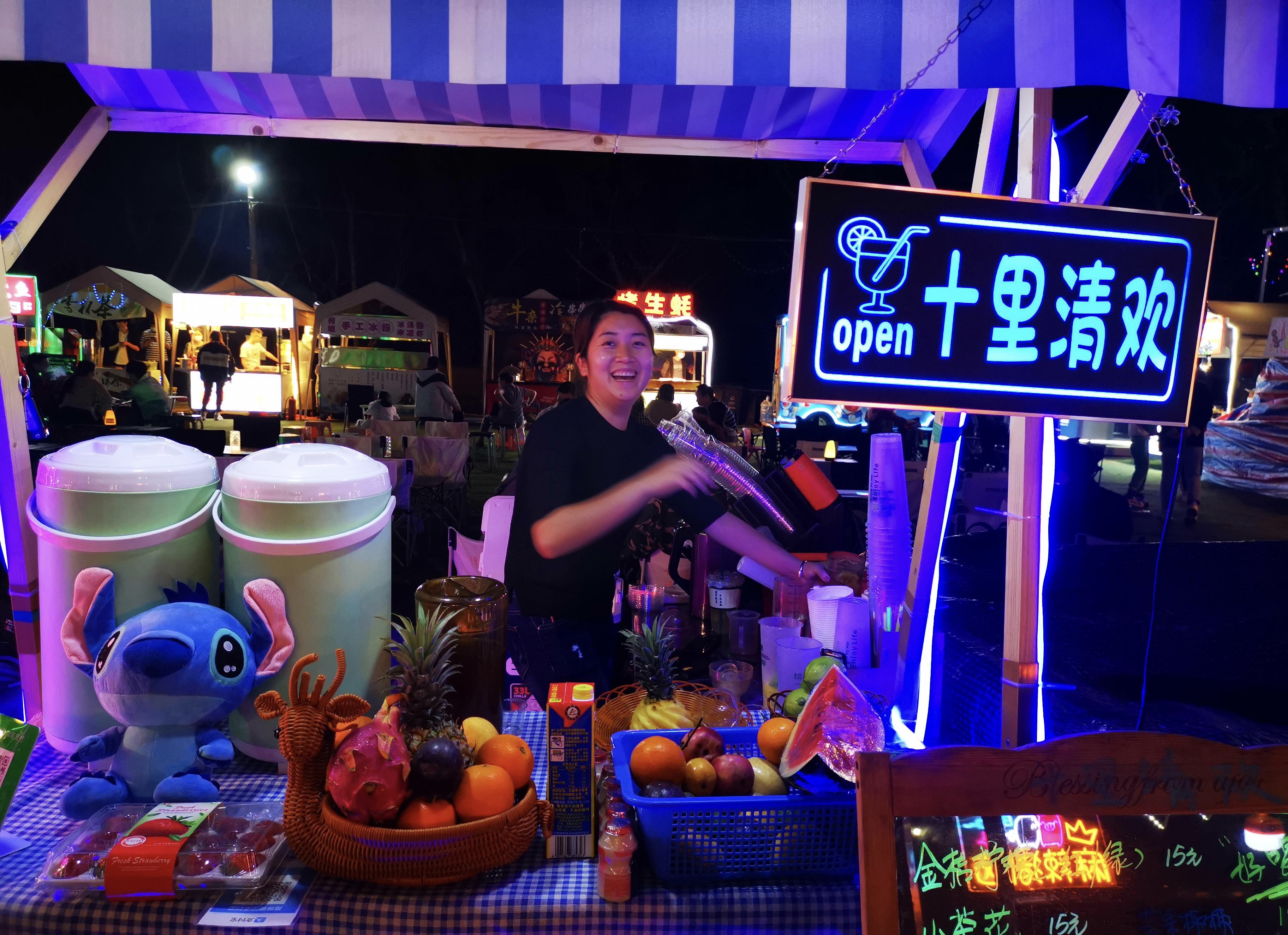 在一家摆摊鸡尾酒、柠檬茶的档口,记者采访了创业者周先生,他说,白天在自己创办的一家公司上班,晚上6时多来这里摆摊,与妹妹一起租了两个摊位,忙到次日凌晨1时或2时才回去,虽然比较辛苦,但在这里摆摊亲近大自然,没有压抑感,一个月可挣到1万多元的收入。摆卖果汁的冯小姐则表示,她在白天也拥有一份工作,晚上下班后用小汽车的后备厢装上一些原材料、器具来这里摆卖,投入少,见效快,成本简单,一方面可以赚一点小钱,另一方面也让她感受到了创业的快乐。