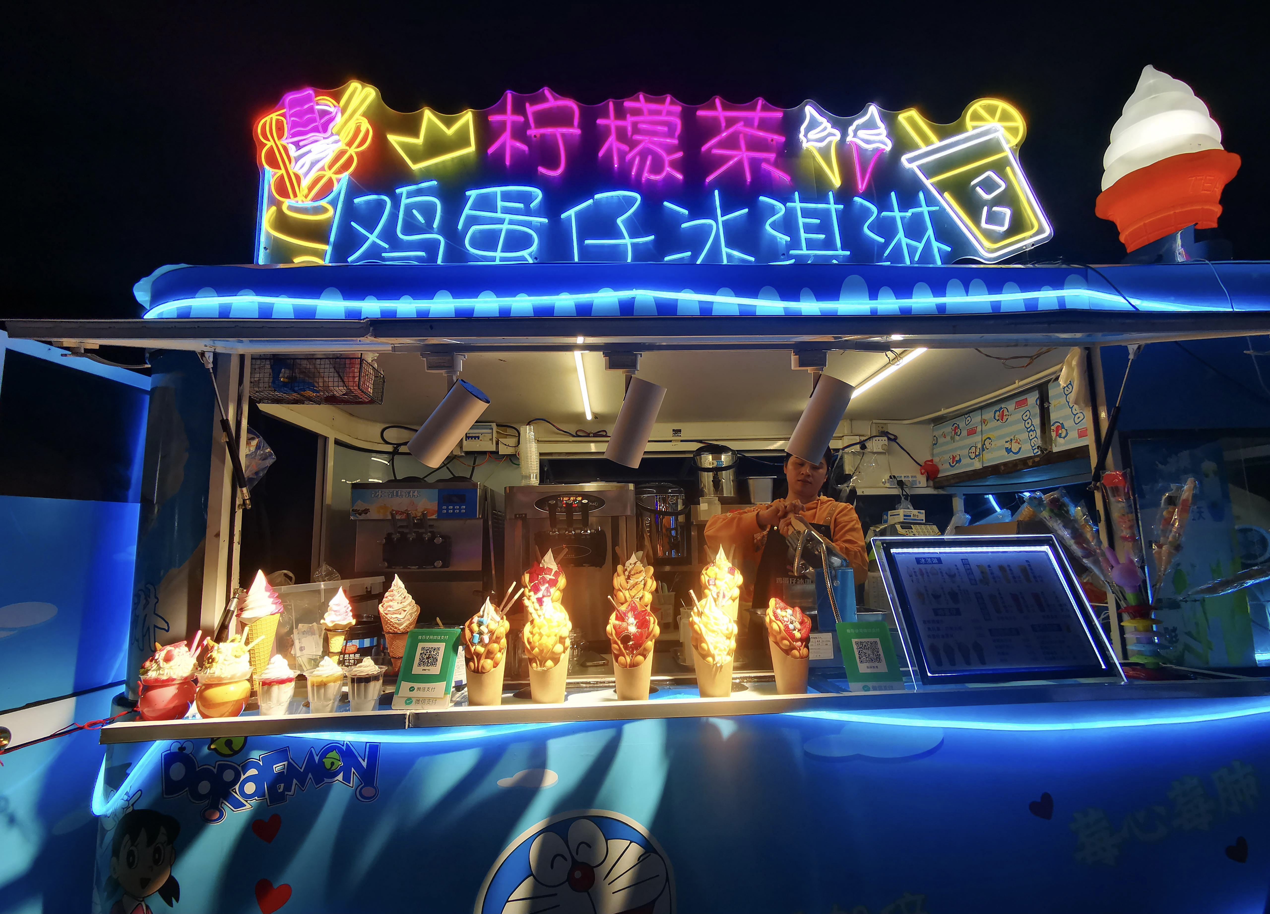 晚上8时过后,来这里逛夜市的人逐渐增多,以年轻人为主,三五人露天围成一桌,一边尝美味、喝饮料,一边谈天说地。