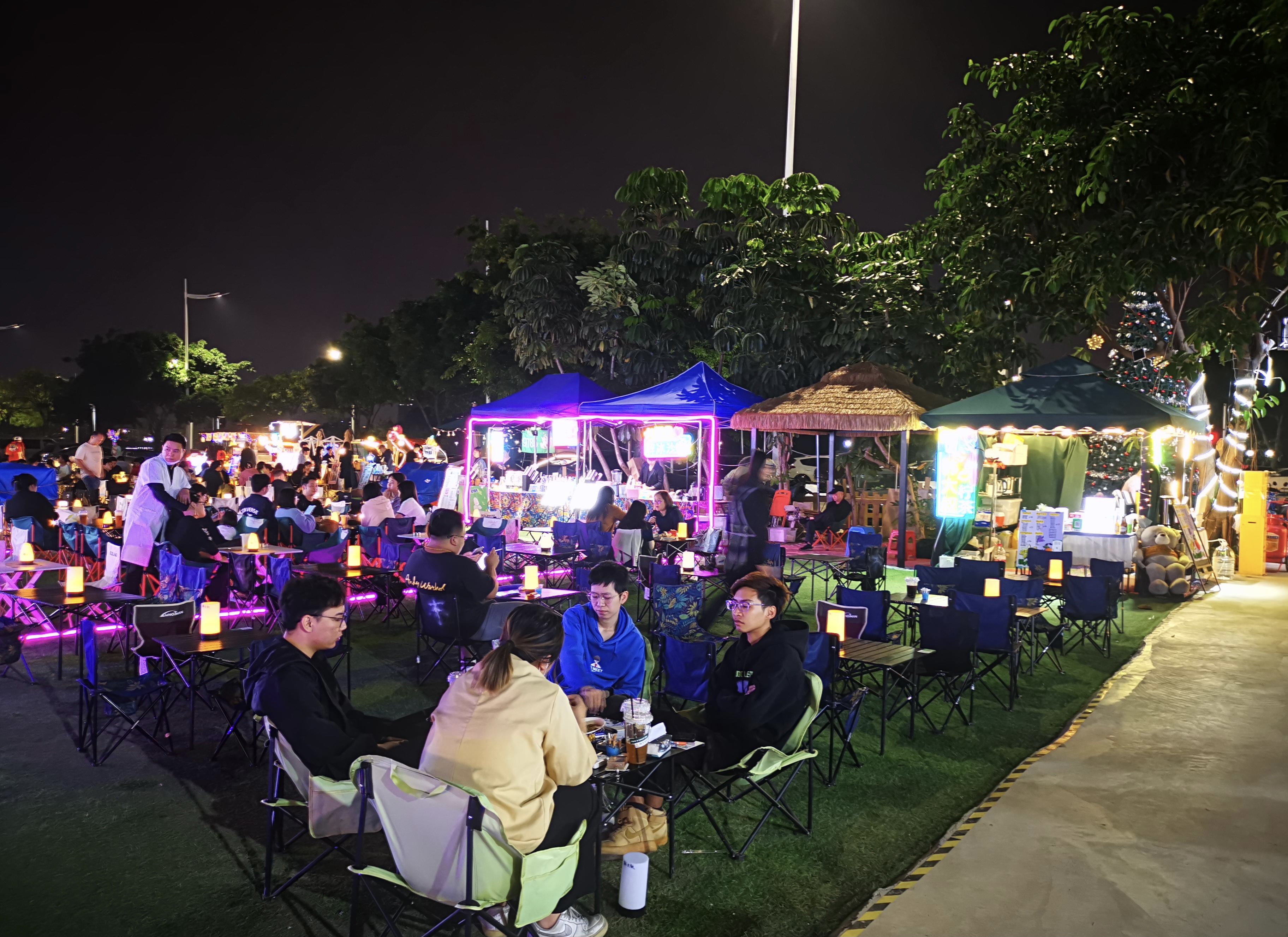 近日傍晚7时多,记者来到桥南街南堤东路囍悦楼东侧地块的囍营地,占地面积约2000平方米的地块上帐篷摊位、车尾厢摊位、移动餐柜摊位等有序排列,摊位绕着场地周边摆一圈,场地中间再摆两排,摊位与摊位之间的空隙地带摆放着露营用的小桌凳,形成一个露天美食集市。
