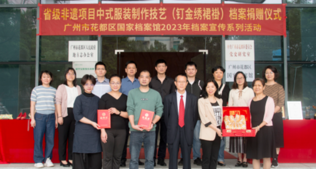4月13日,花都区国家档案馆举办了省级非遗项目——中式服装制作技艺(钉金绣裙褂)档案捐赠仪式,这标志着省级非遗项目中式服装制作技艺(钉金绣裙褂)档案入藏花都区国家档案馆。