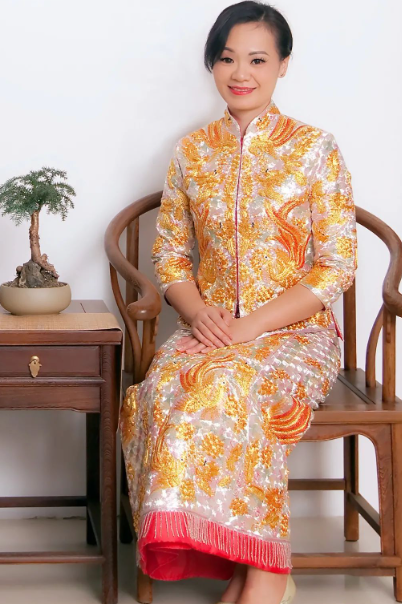 2021年中式服装制作技艺(钉金绣裙褂制作技艺)被列入广东省第八批非物质文化遗产保护名录,2022年钉金绣裙褂服饰(花都区小茹裙褂设计室作品)成功入选2022广东非遗服装服饰优秀案例。