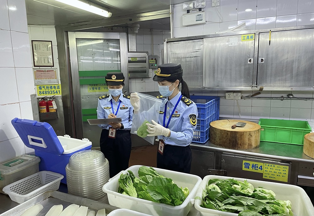 番禺是美食之都,素有“味在番禺”的美誉。为加强食品安全监管,4月13日上午,番禺区市场监管局执法人员来到番禺宾馆后厨,检查现场环境卫生情况,并对食材、碗筷等进行抽检。该局餐饮监管科科长古劲表示,近日他们加大了对定点接待酒店、广交会嘉宾入住酒店配套餐饮场所及周边的检查力度,加强商业广场、餐饮集聚区及网红中西餐厅等场所的监管,全面排查食品安全隐患。对有关重点餐饮场所开展食材快速检测筛查,防止不合格食品流入餐桌。4月以来,共出动356人次,检查餐饮单位1702家次,快速检测食材570批次。
