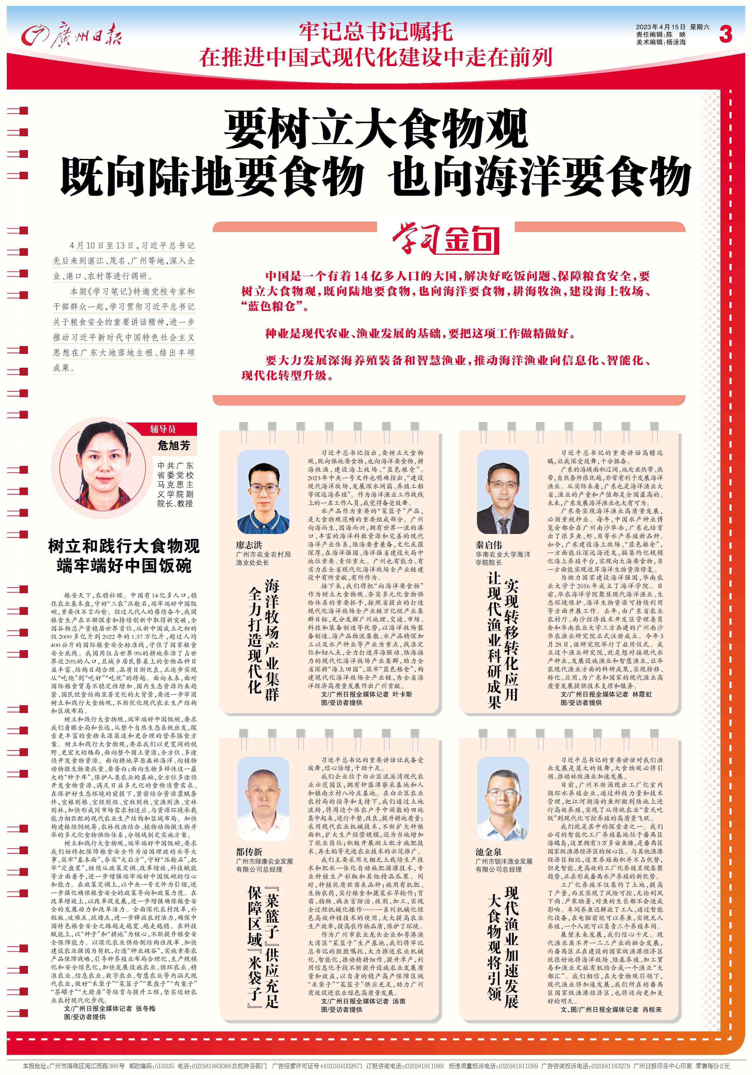 水产品作为重要的“菜篮子”产品,是大食物观范畴的重要组成部分。广州向海而生,因海而兴,拥有世界一流的港口、丰富的海洋科教资源和完善的现代海洋产业体系,陆海要素兼备,文化底蕴深厚,在海洋强国、海洋强省建设大局中地位重要、责任重大。广州也有能力、有实力在全省现代化海洋牧场全产业链建设中有所贡献,有所作为。
