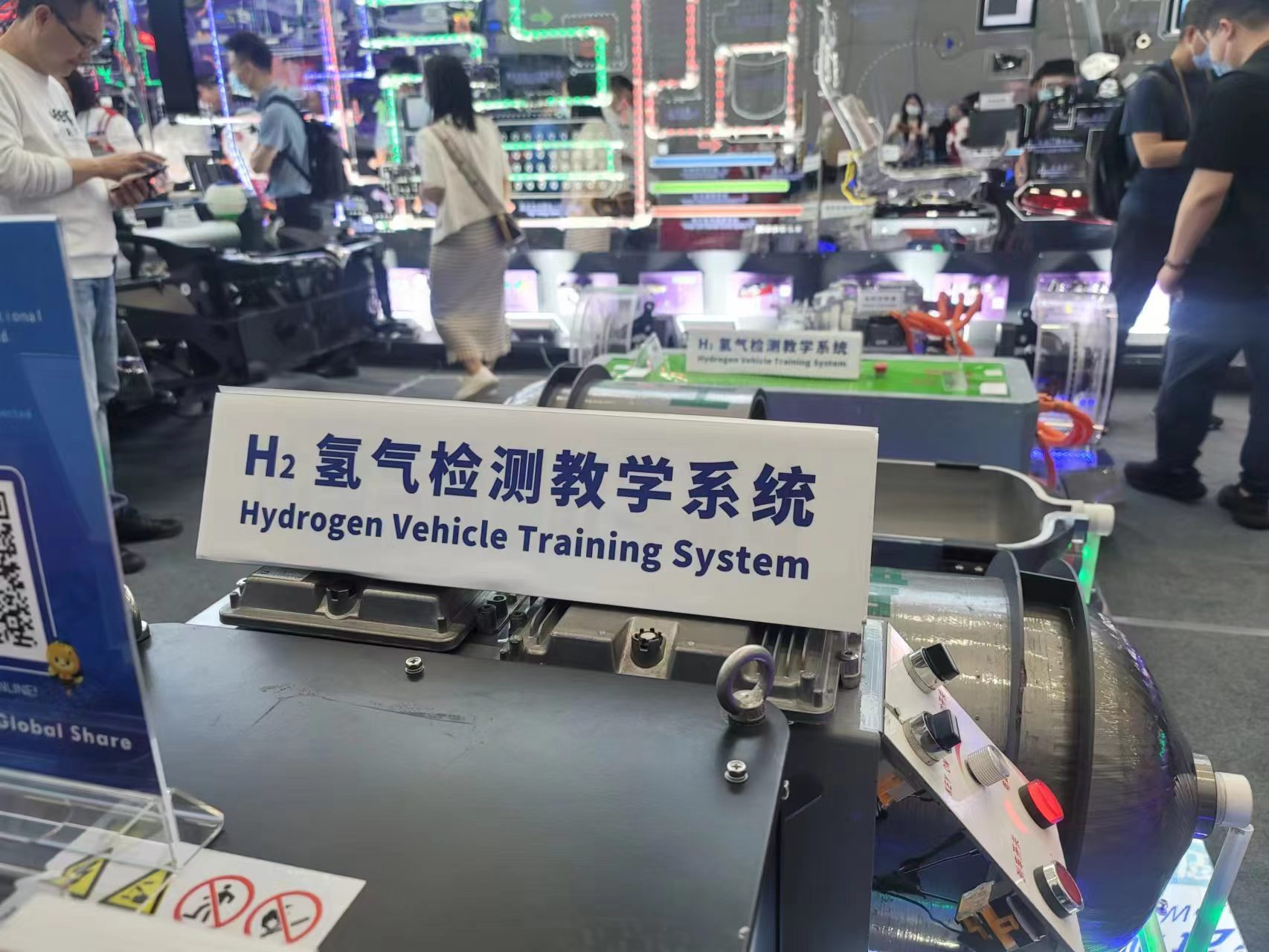 位于广交会D区展馆的新能源及智能网联、无人驾驶、氢能汽车展区,新能源汽车的三电和智能座舱系统实车教具展示十分抢眼醒目。