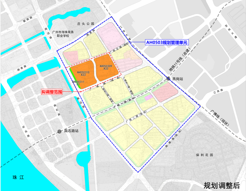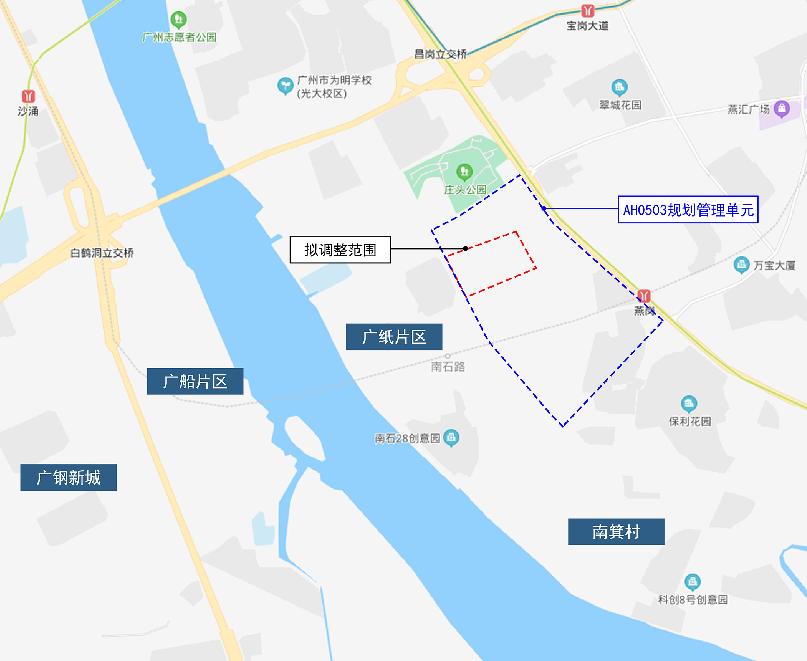 此外,在不调整道路宽度与走向的前提下,对广纸东三路线位进行局部优化;以保证建筑面积不变为前提,修正AH050309地块边界与用地面积,用地面积由20460平方米调整为21475平方米,其他建设控制指标不变。