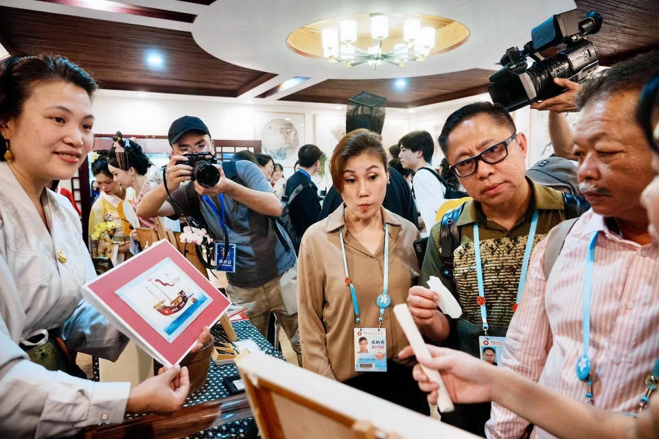 之后,嘉宾先后来到同馨厅、国香馆。沿途恰逢太湖石上古琴演奏,正是一曲《高山流水》。琴声悠扬而高亢,如登峨峨泰山、如临洋洋江河,引得嘉宾不时击掌赞叹。国香馆内,馨香袅袅,书画大师潇洒挥墨,让各国嘉宾身临其境地感受中国传统书画文化和品香特色。