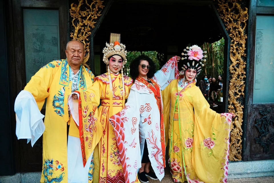 数十名考察团成员分别来自马来西亚、印尼、巴西、土耳其等地。来到“兰缘盛荟”活动地,考察团嘉宾置身于岭南园林——广州兰圃,品味聆听古琴、横笛等传统民乐演奏,观赏粤剧演出、体验燃香品茗,穿上传统戏服、提笔挥毫。