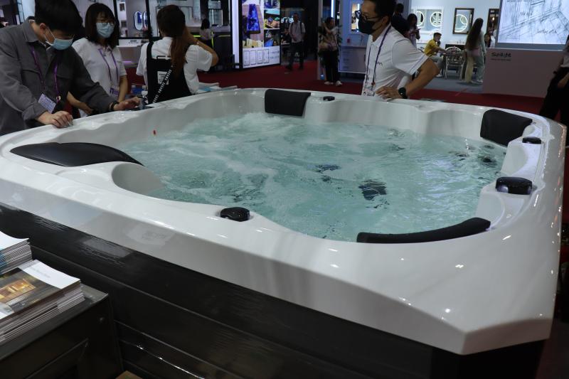 16日上午,记者来到广交会B区展馆的卫浴设备板块,智能马桶、水龙头、洗漱镜、淋浴室等展品琳琅满目。但其中最吸引眼球的非智能按摩水疗池莫属。这个有着浴缸的外观,但占地面积达到5平方米,内壁上还有按摩水疗装置,售价约2万元人民币,在国内并不常见的水疗池,在国外市场十分畅销。