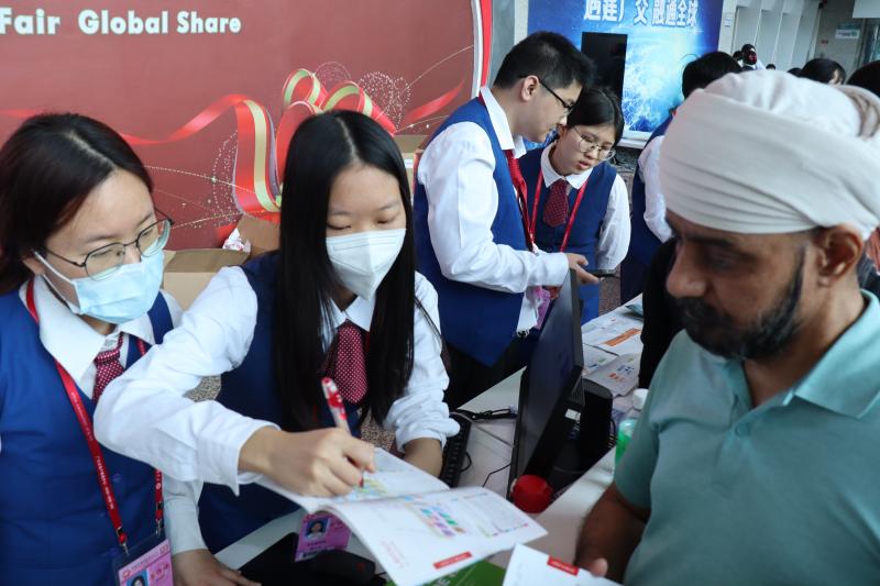 唐同学正在指引外商到相应的展位。信息时报记者 康振豪 摄