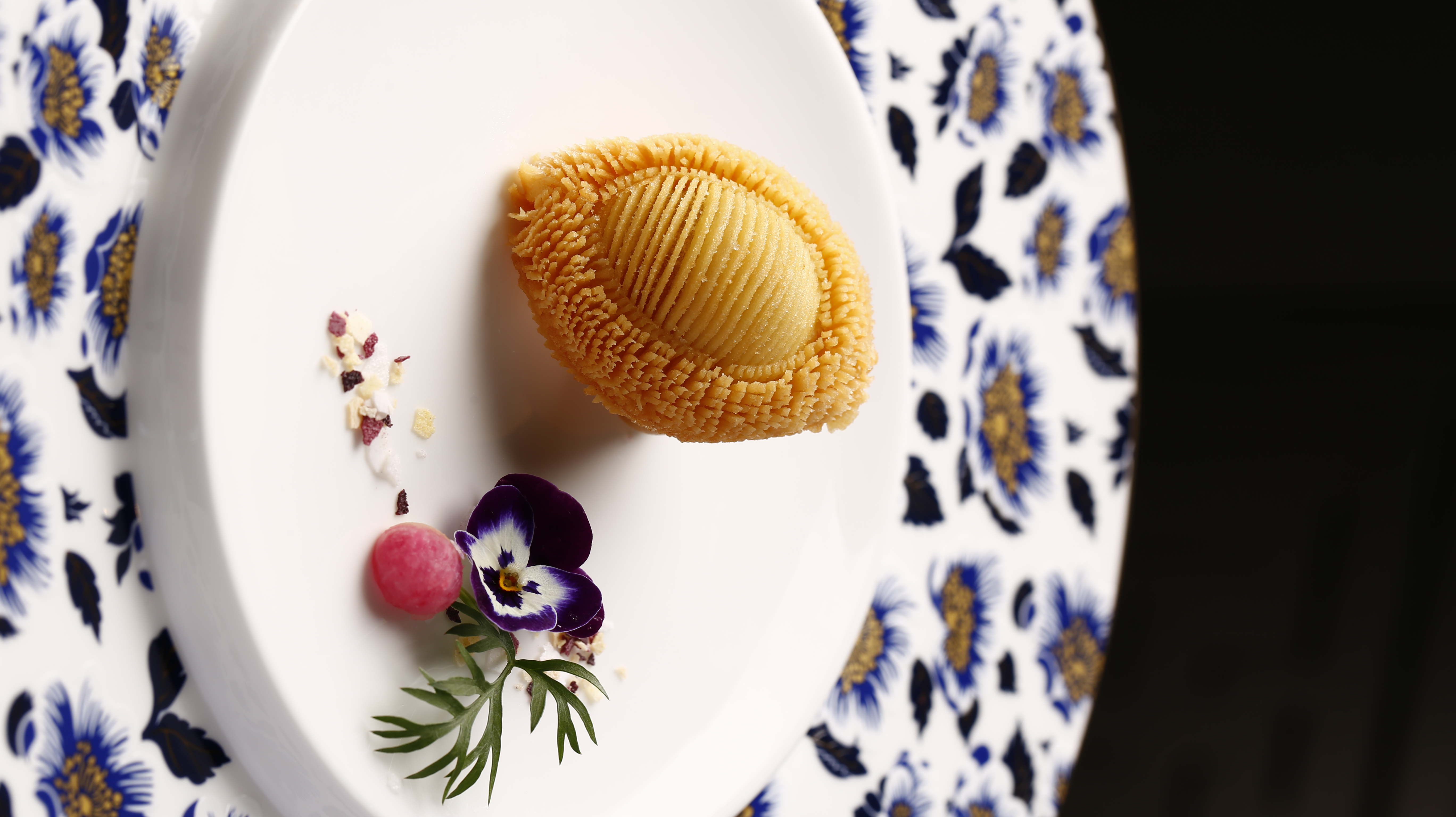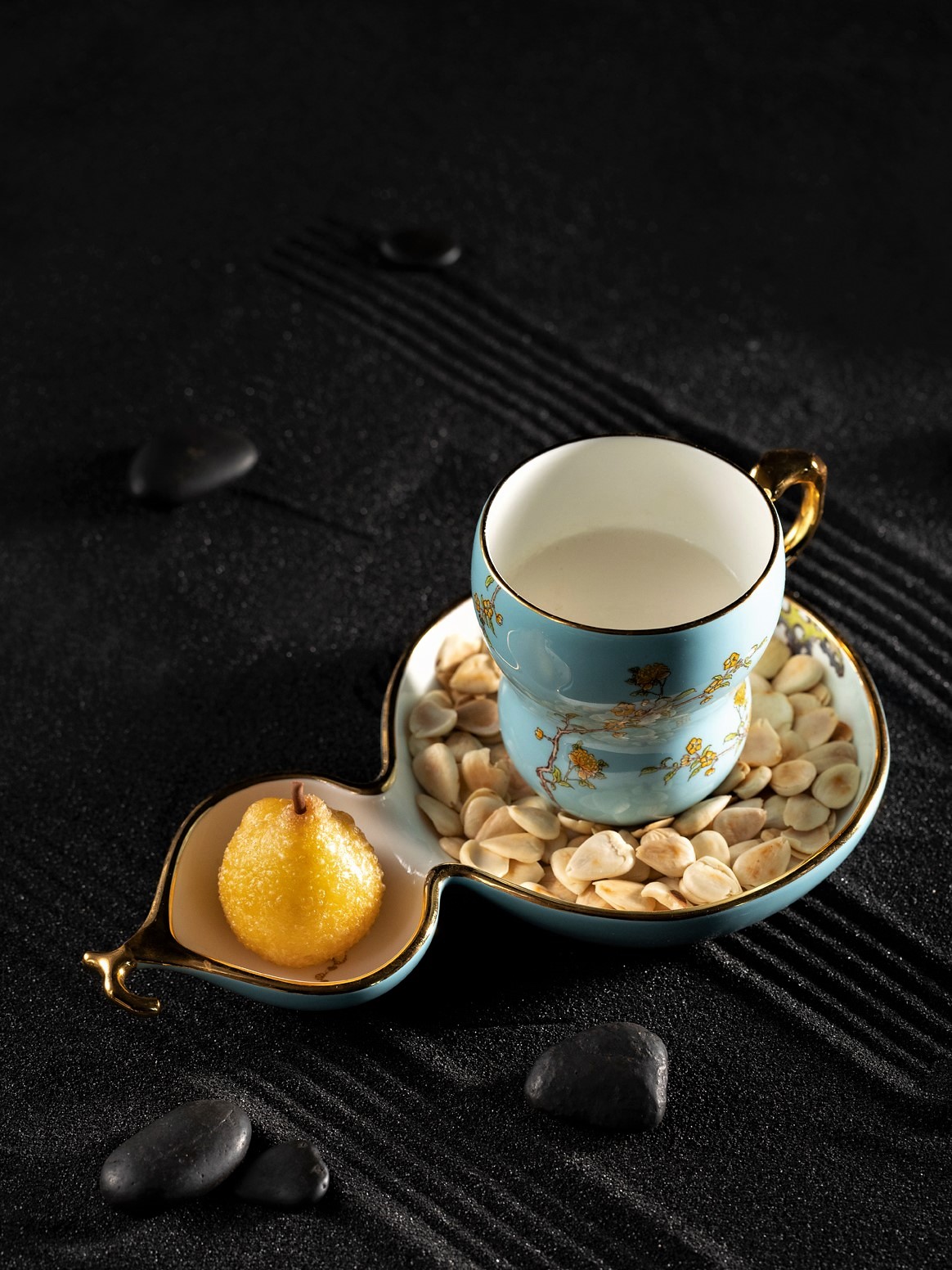 芝士肉松雪梨酥,出自广州保利洲际酒店御公馆,乍一看,神似雪梨。在炸成澄黄的表皮下透出如荔枝肉一般的半透明的白色,这是糯米粉和澄面混合的面皮色泽。雪梨酥外层酥脆内心软糯,馅料有肉松和咸蛋黄,体型精致小巧的,风味饱满,喜欢糯糯质感的食客相当喜欢它。这是一款亲和力相当好的甜品,搭配热气升腾的蛋白杏仁茶,或者清凉的杏仁豆腐,可谓主角配角都展现独特的个性。