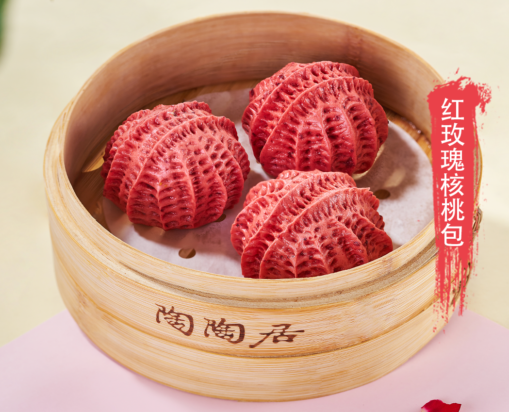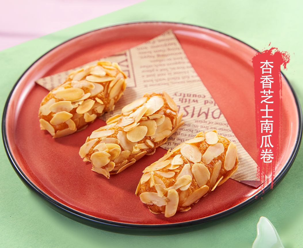 牛油果蜜柚酥皮包代表了“绿”,一只只翠绿的酥皮包,甚是养眼。其外皮之绿从何而来?原是融合了菠菜汁、牛油果而成。里头是超满的馅料:蜜柚果肉和苹果果肉。豪迈地一口咬开来,绿油油的酥轻轻洒落,甜蜜的果肉绽现,一起吃才过瘾。“红玫瑰核桃包”由纯手工包制,加入了红玫瑰汁液,成就了眼前的“红”。掰开包点,满满的巧克力和核桃肉。“杏香芝士南瓜卷”色彩明亮,师傅选用粉糯金瓜,瓜肉细腻绵密,内馅塞满香浓芝士,外皮裹上满满杏仁片,油炸至金黄出锅。轻轻一拉,还能有芝士拉丝的质感来,南瓜香气满满,每一口都是南瓜的香甜。“流心脆蜜紫薯果”代表“紫”,这款紫薯点心十分小巧,造型玲珑迷你,手打紫薯泥裹上白玉脆片,内馅包裹着流心,油炸后外脆内软,口感颇有层次。