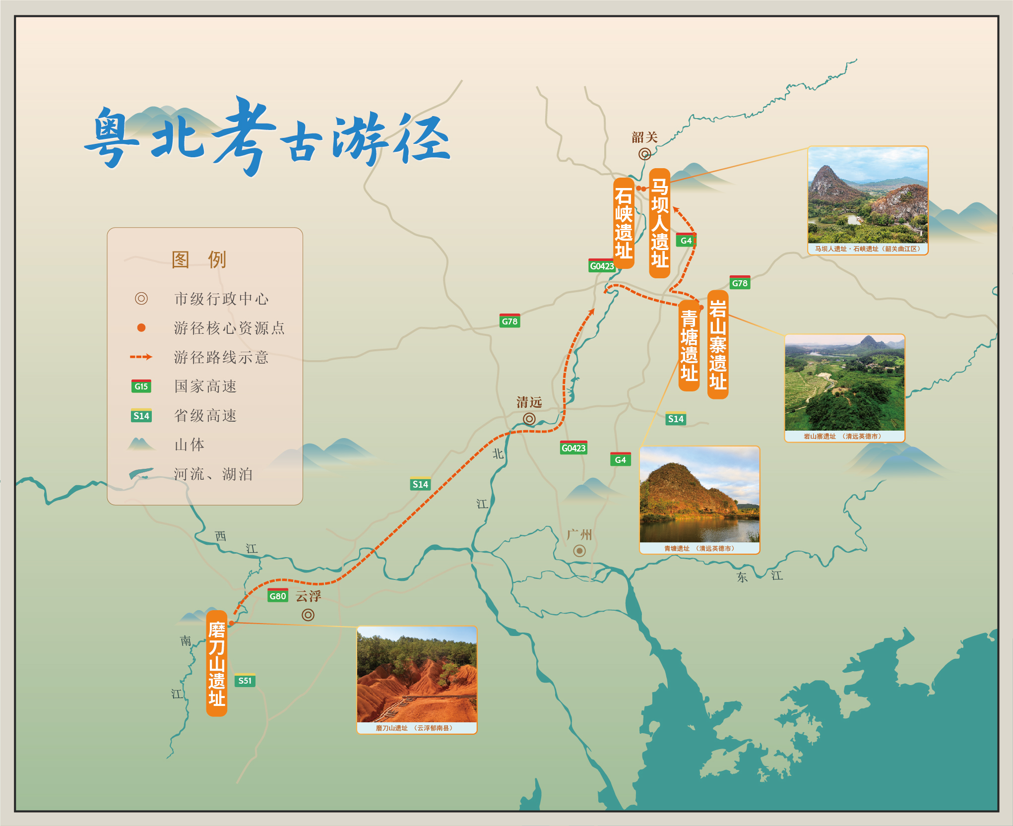 ·粤北考古游径:云浮郁南磨刀山遗址——清远英德青塘遗址——清远英德岩山寨遗址——韶关石峡遗址——韶关马坝人遗址。