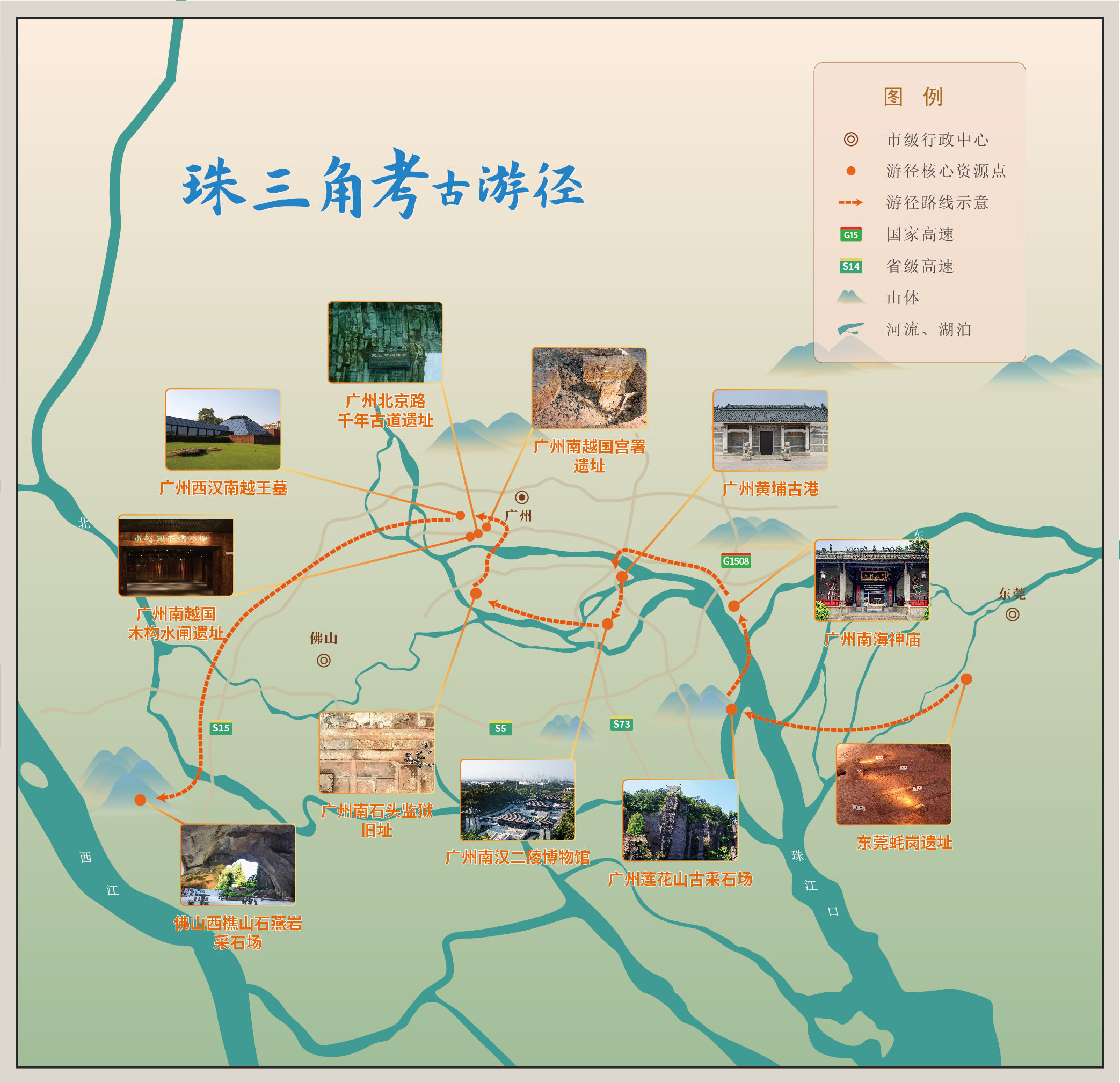 ·珠三角考古游径:东莞蚝岗遗址——广州莲花山古采石场——佛山西樵山石燕岩采石场——广州南越国宫署遗址——广州南越国木构水闸遗址——广州西汉南越王墓——广州北京路千年古道遗址——广州南汉二陵博物馆——广州南海神庙——广州黄埔古港——广州南石头监狱旧址。