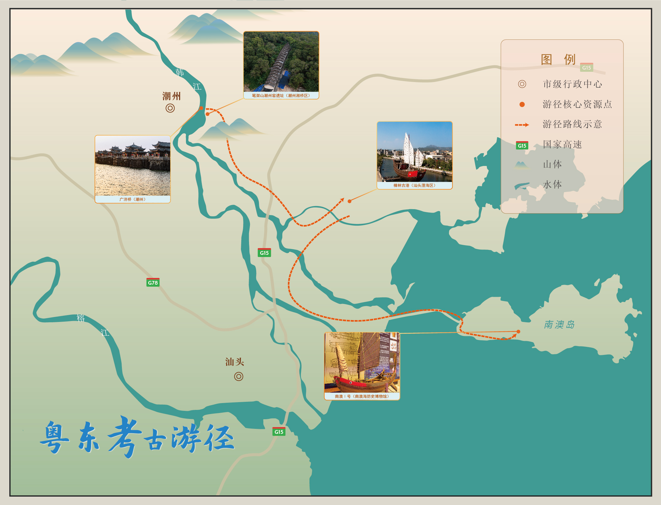 ·粤东考古游径:潮州笔架山潮州窑遗址——潮州广济桥——汕头樟林古港——“南澳Ⅰ号”(南澳海防史博物馆)。