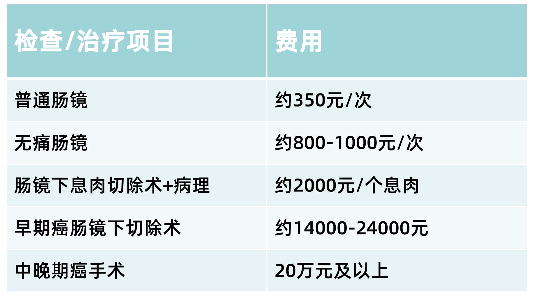 肠镜的检查费用可以参考下表。大肠癌防控项目就是为了发现更多潜在大肠癌患者,在癌症发生前就把病灶去掉;假如发展成大肠癌,不仅治疗费用翻倍,也会影响生活质量。