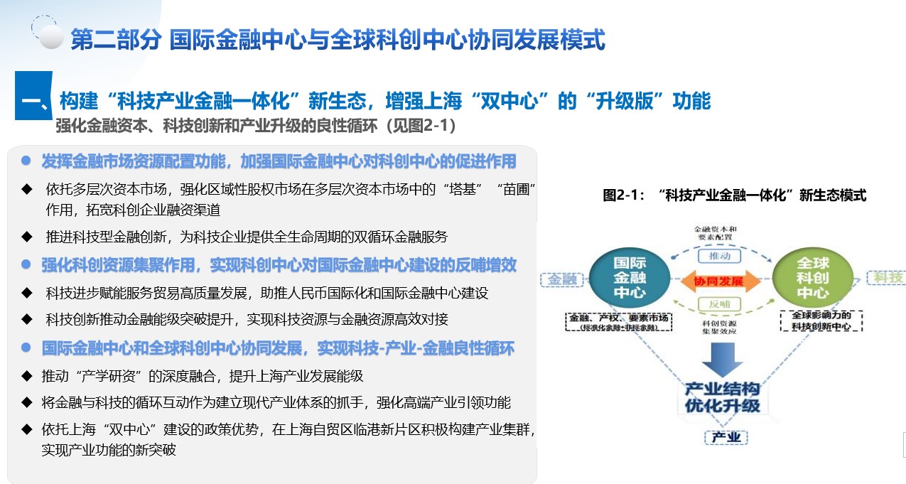 一是构建“科技产业金融一体化”新生态,增强上海“双中心”的“升级版”功能,强化金融资本、科技创新和产业升级的良性循环;二是打造“金融机构+交易平台+科技创新”的发展新模式,推进金融和科创双向赋能,发挥标准化和非标交易平台各自的功能优势,实现科创服务市场和基础设施体系的有机整合;三是以金融资本推动科技成果转化,促进科技赋能产业升级;四是提升金融科技发展能级,以科技创新推动金融高质量发展。