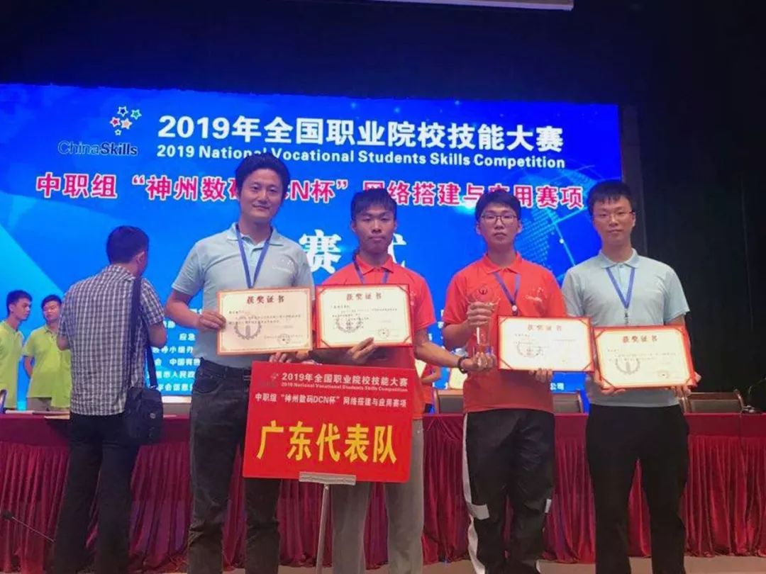广州市信息技术职业学校在2019年度全国职业院校技能大赛中夺得“网络搭建与应用”一等奖,参赛队伍:薛宁海老师、黄嘉濠同学、吴泽权同学、杨文浩老师