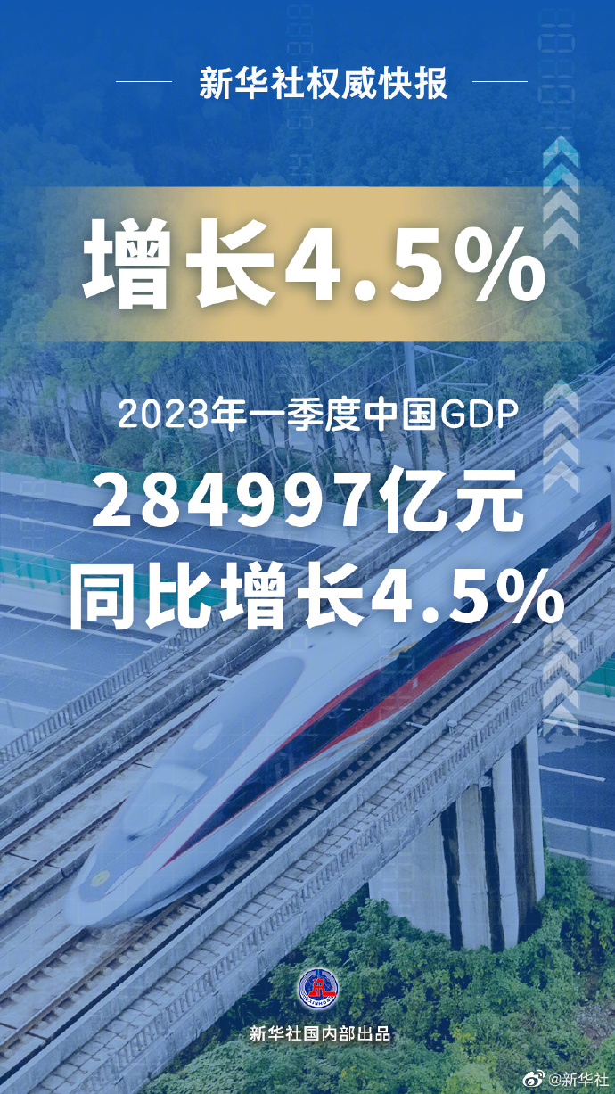 今天,国家统计局发布2023年第一季度国民经济运行情况:初步核算,一季度国内生产总值284997亿元,按不变价格计算,同比增长4.5%,比2022年四季度环比增长2.2%。