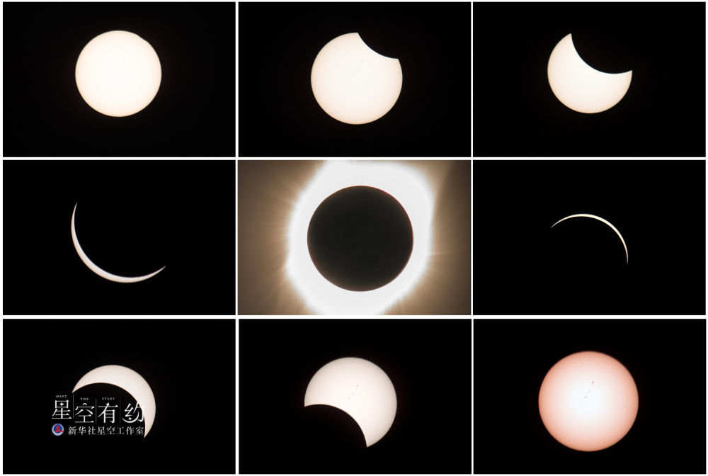 2017年8月21日在美国俄勒冈州塞勒姆拍摄的日全食过程的拼版照片。新华社记者 殷博古摄
