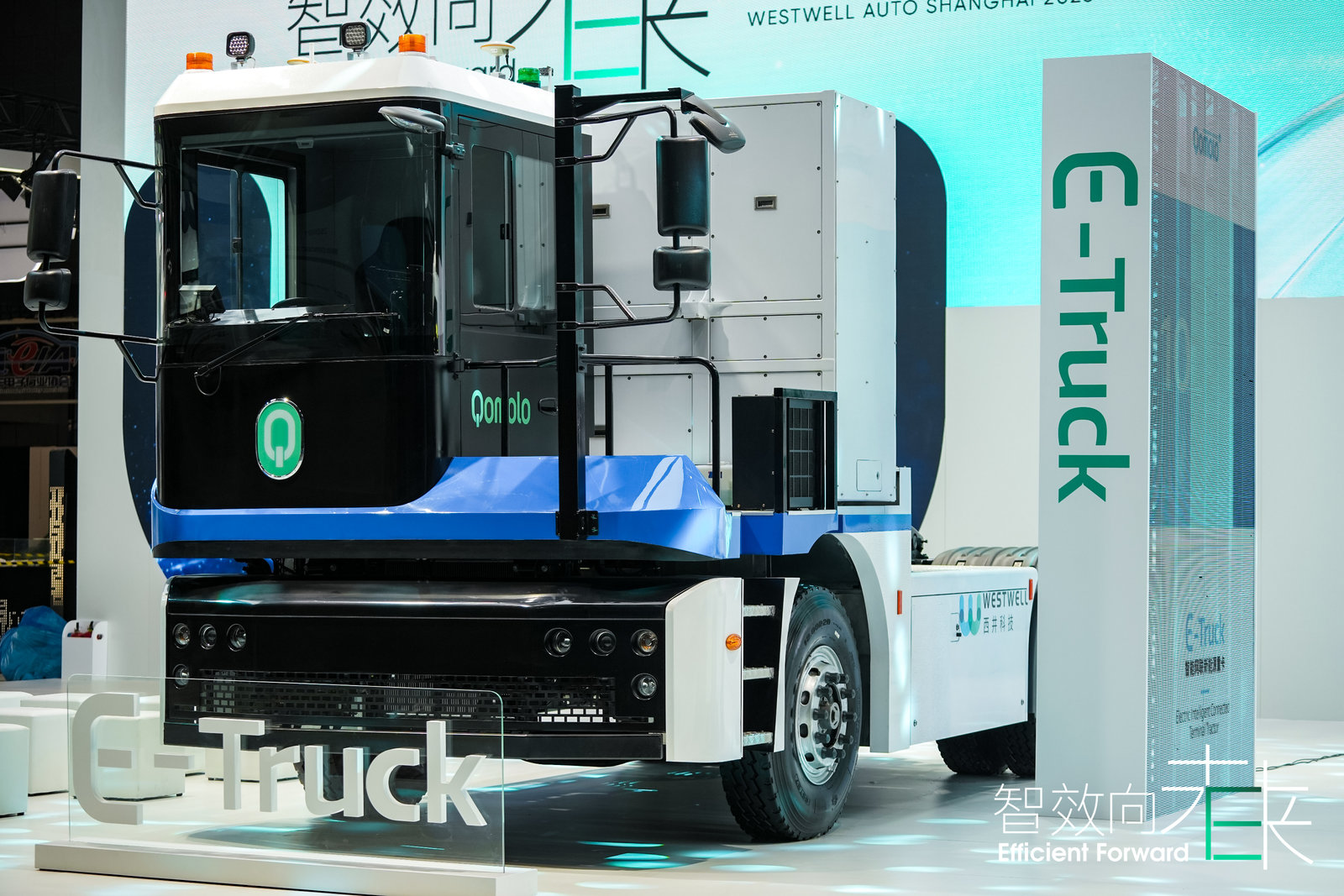 记者在上海车展上看到, E-Truck外观表面经过防腐防盐雾的特殊处理,车架更采用的DL700高强度钢,令其无惧使用严寒酷暑中工作。车辆搭载的一体化智能座舱,还配备了疲劳驾驶监控与人机交互终端。