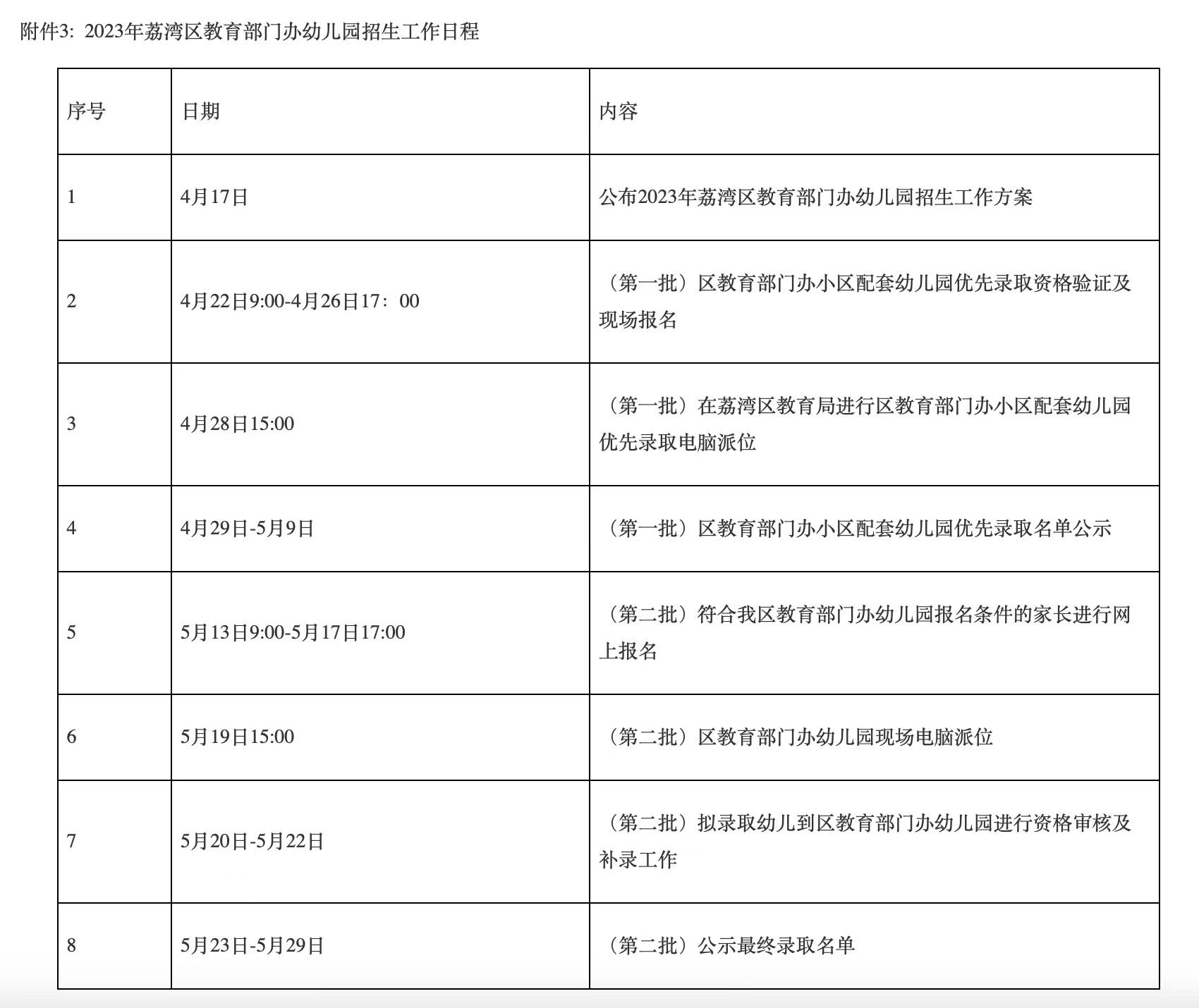 2023年荔湾区教育部门办幼儿园招生工作日程