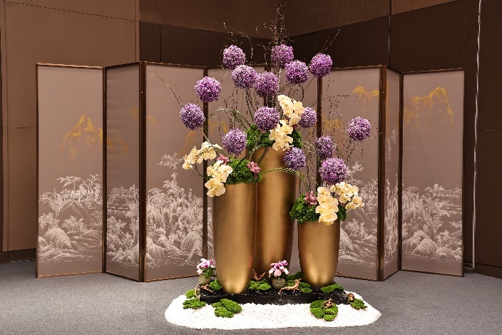 第二个发现:一楼大堂里,繁花似锦,紫气东来。一座融合了紫色满天星、白叶蝴蝶兰、云南绿毛球、大花惠兰的大型花艺作品,坐落在广州越秀国际会议中心迎客之处。工作人员介绍,这个花艺作品设计理念源自广州著名的代表景点白云山。