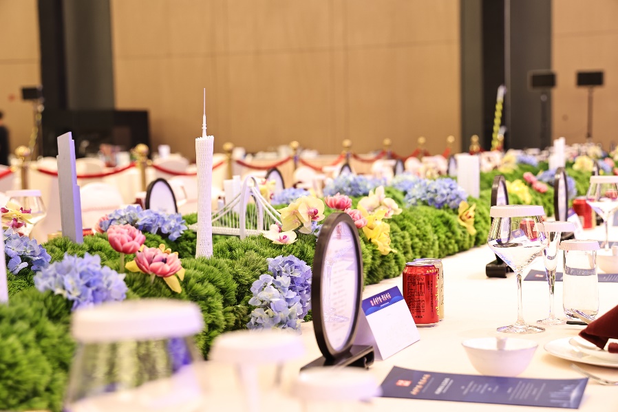 第一个发现:“羊城新八景”,既体现在菜中,也再现在桌上。一条“珠江”流淌过长长的主桌,广州塔、猎德大桥、西关老屋等微缩模型点缀在鲜花之间。工作人员介绍,今年的欢迎晚宴精心布置了晚宴主桌花艺和摆桌的装饰。仔细看,云山叠翠、珠水夜韵、越秀新晖、天河飘绢、古祠留芳、五环晨曦、黄花皓月、莲峰观海“羊城新八景”逐一再现。