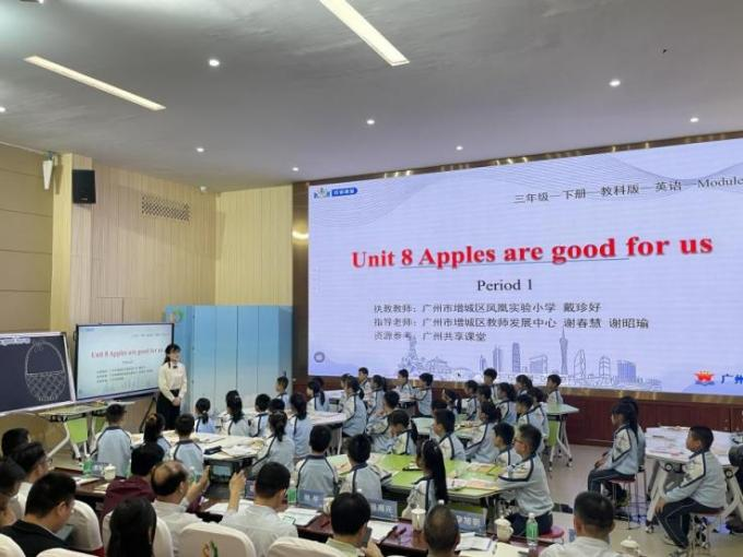 在课例展示中,增城区凤凰实验小学英语老师戴珍好灵活运用“广州共享课堂”资源,学生则积极参与课堂实践。戴珍好介绍,在课堂教学中,教师结合学生的实际学情,以课程标准为指导,应用“广州共享课堂”的资源,例如教学思路、教学活动、教学素材等,对共享课堂资源进行创新,创设情境,让学生在实践中学以致用。