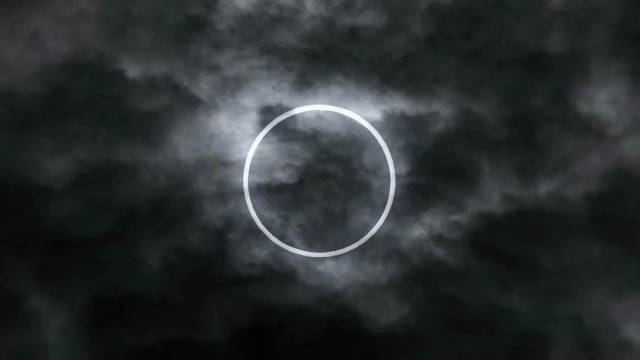 月亮在太阳的中心,但无法遮住整个日面。一个“光环”包在月球外围。
