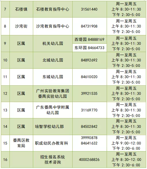 番禺区各镇街、区属幼儿园招生工作单位、咨询电话一览表