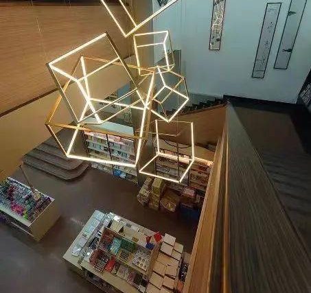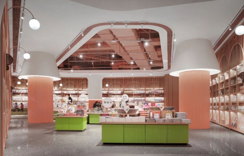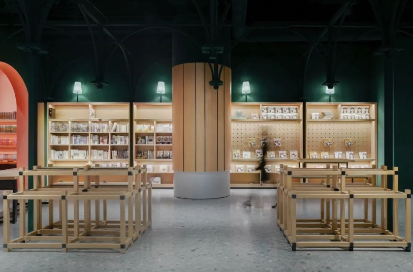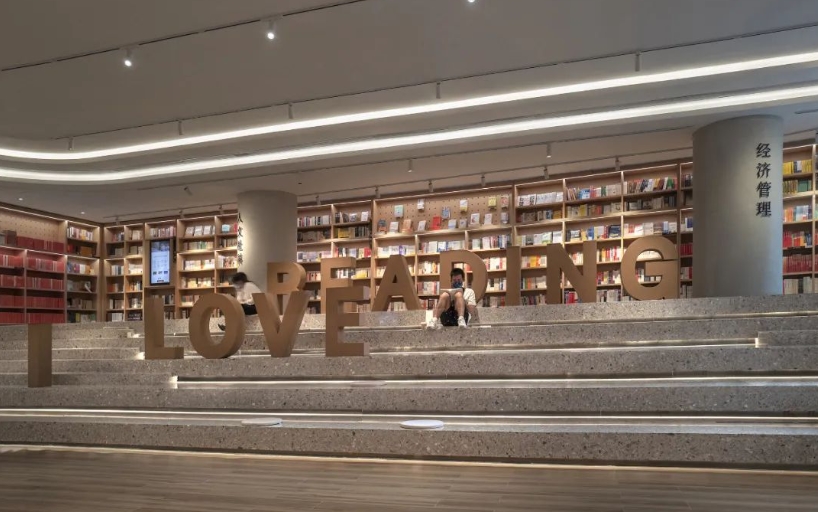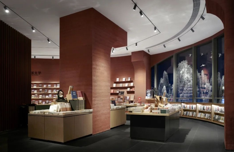 位于番禺万博商务区的广州购书中心番禺店总面积约3000平方米,平面空间为断续带状分布。这家书店的设计以传统山水、自然美学为载体,结合情感体验解构重组,让空间产生新的阅读维度。原木书架延伸视觉体验,镂空红砖搭建全新阅读空间,重新定义“你我的城市文化共生家园”的理念, 将装修风格将极简与中国风发挥到极致,曾斩获法国巴黎DNA室内设计类别大奖“优胜奖”。